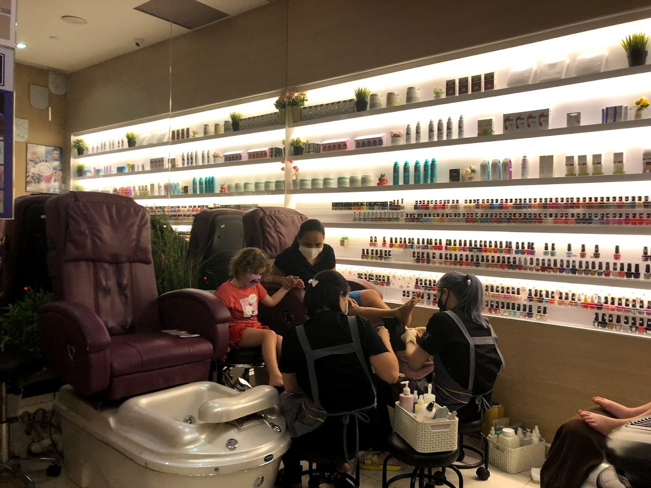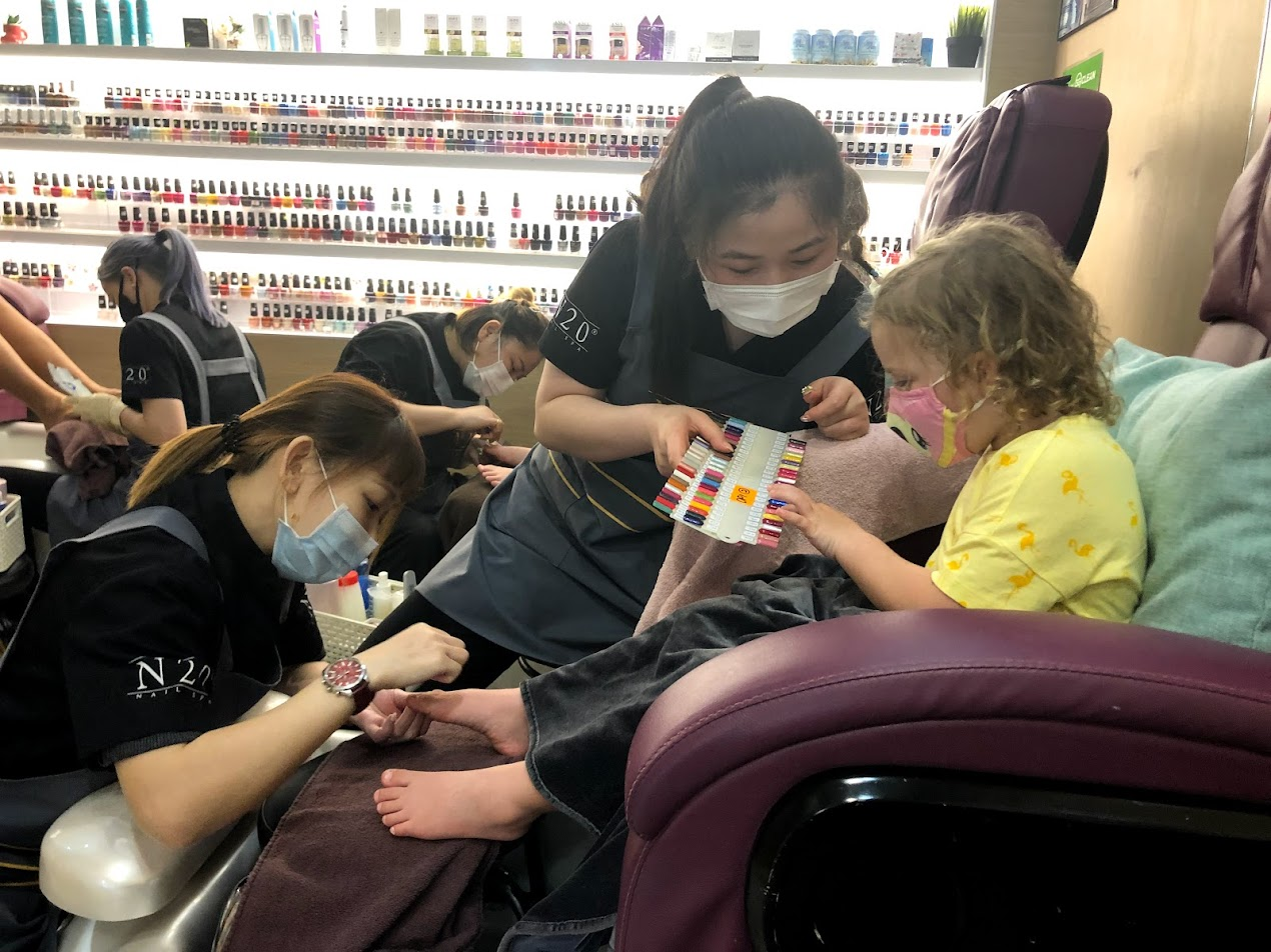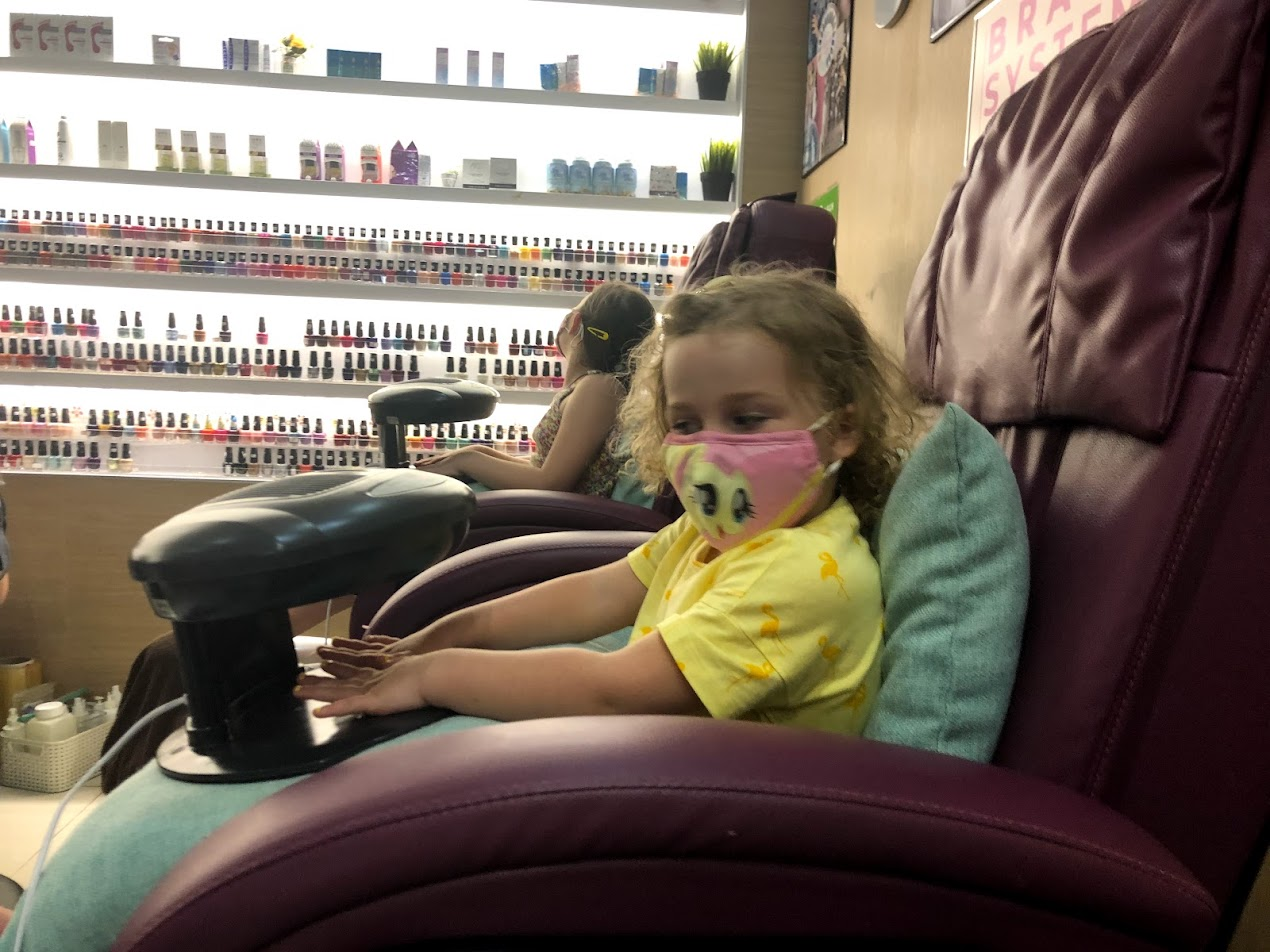 We had the whole side of the salon to ourselves and a team of ladies waiting to help us when we arrived. MsI climbed up in a big chair, but then needed me to sit beside her. She really got into it when they gave her the nail polish choices. She chose Gold for her finger and Silver for her toes. She told the ladies all about how Gold was her favorite colour and they giggled away at her. MsE let them cut her nails, paint them and even used Nail Dryer.