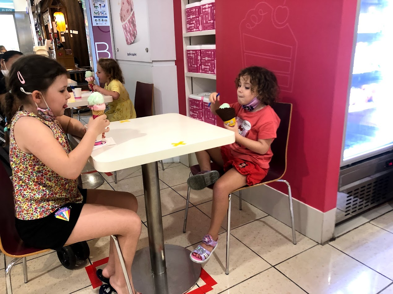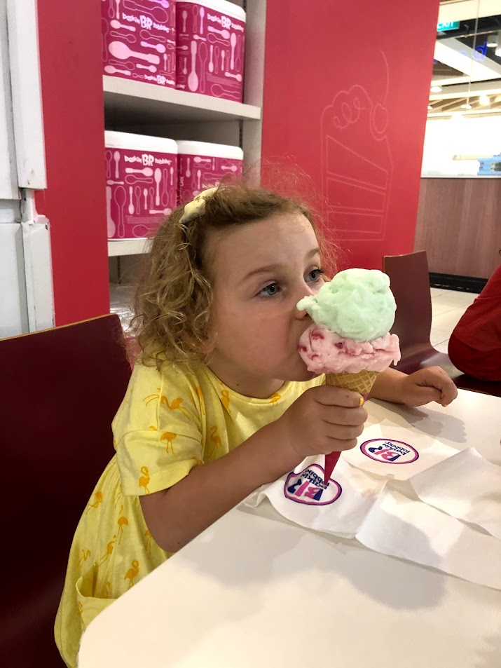 Walking back from our Pedicure, MsI declared that it was ice cream time so, and we had to walk past Baskin Robbins. Those are strawberry and lime dairy free sorbet, and chocolate waffle cone for MsE who can eat dairy.