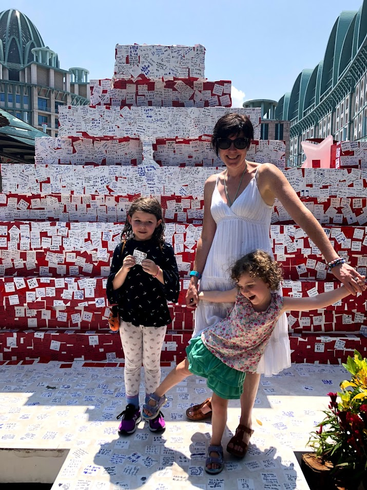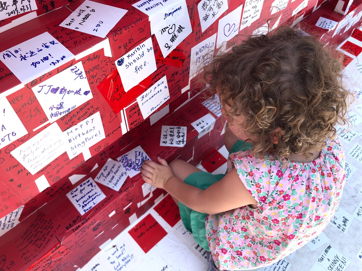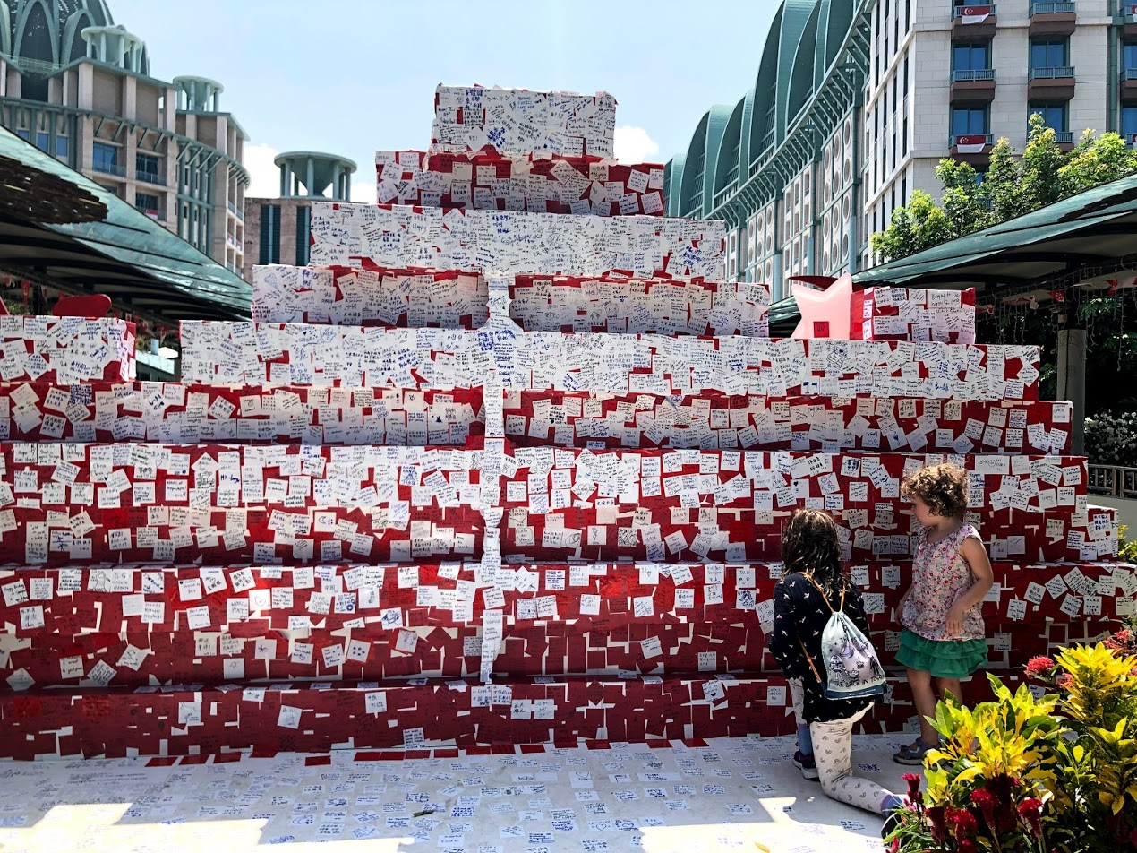 Happy National Day! We made a wish for Singapore's future and added it to the wall on Sentosa. Ms.E's said, "Singapore I love you. You are the best." Ms.C's said, "I wish the Sentosa Merlion was lit in the day." It took a long time to find just the right spots for their wishes.