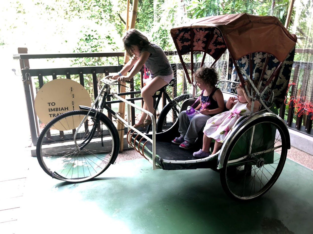 The lower floor has interesting pieces from Singapore's past. We came across the Tricycle Rickshaw below right after reading a poem and wondering what one looked like. The kids love to play the drums in the playhouse Kampong home.