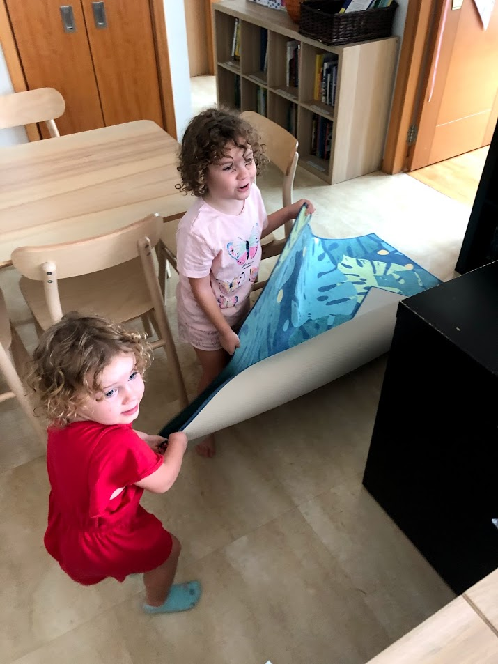 They started by spreading MsE's carpet on the living room floor to have a softer place to work. We didn't want to scratch the marble floors.