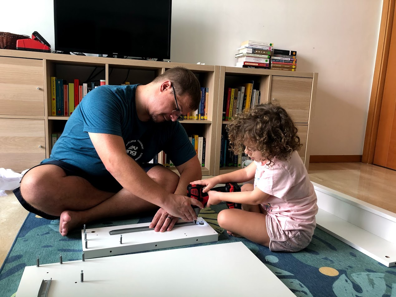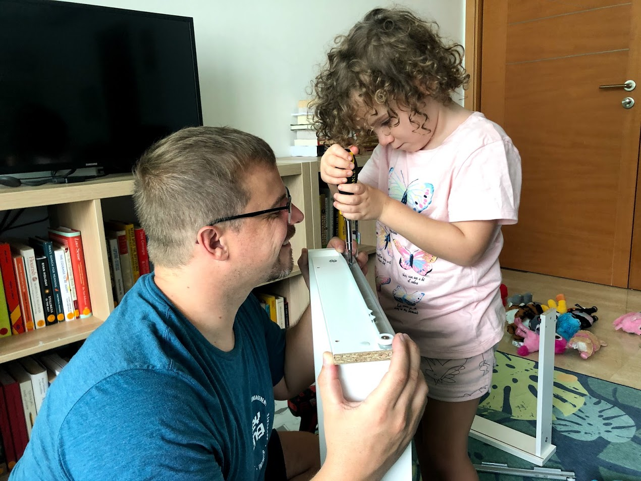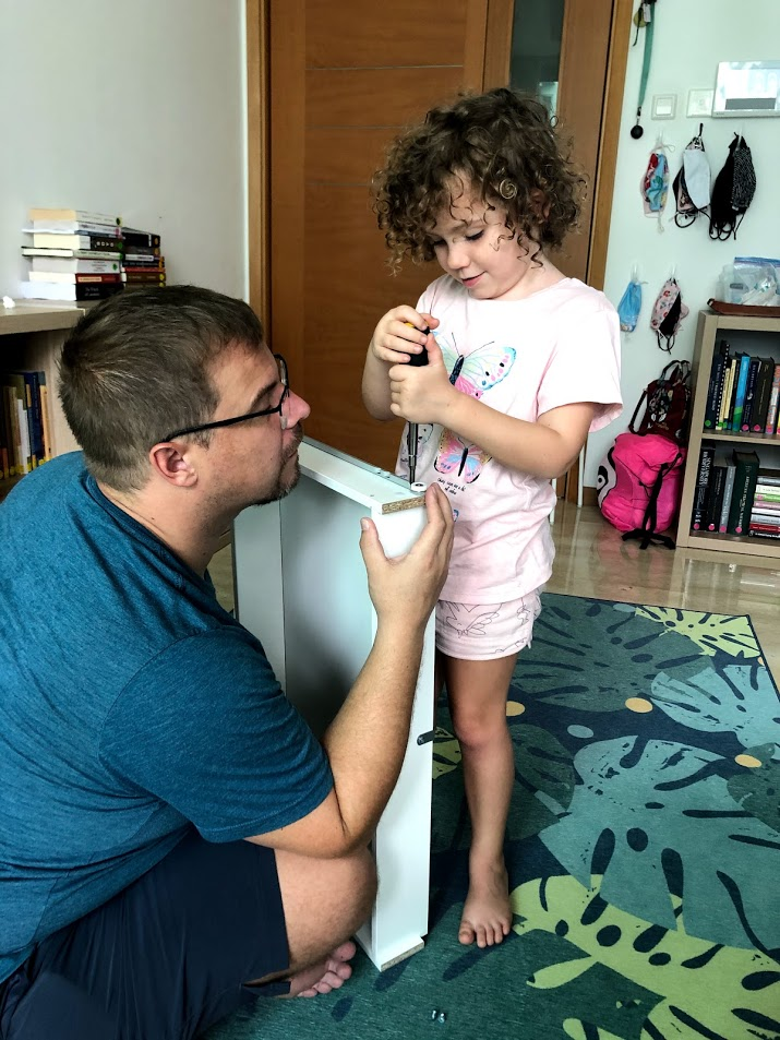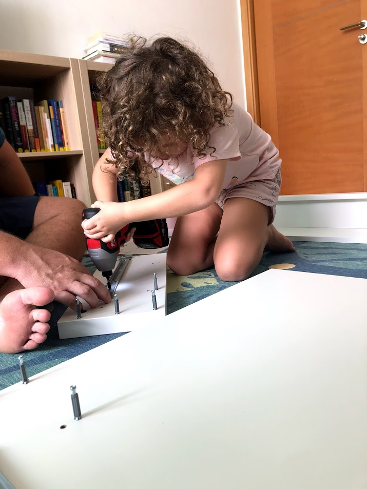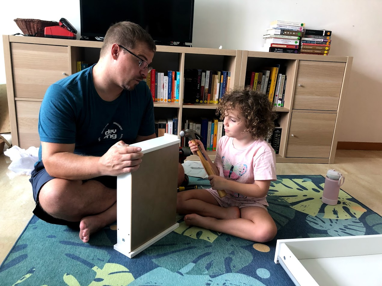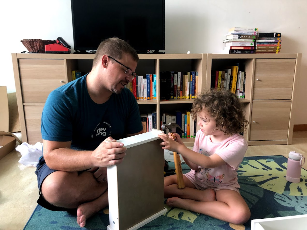 MsE build the whole desk and swivel chair herself, including using the hammer, screw driver, and power drill herself. Jonathan just pointed out where things went and helped hold things steady for her. It took a while to get the Ikea desk with it's drawer and shelves together, because MsE seriously did every screw and peg herself.