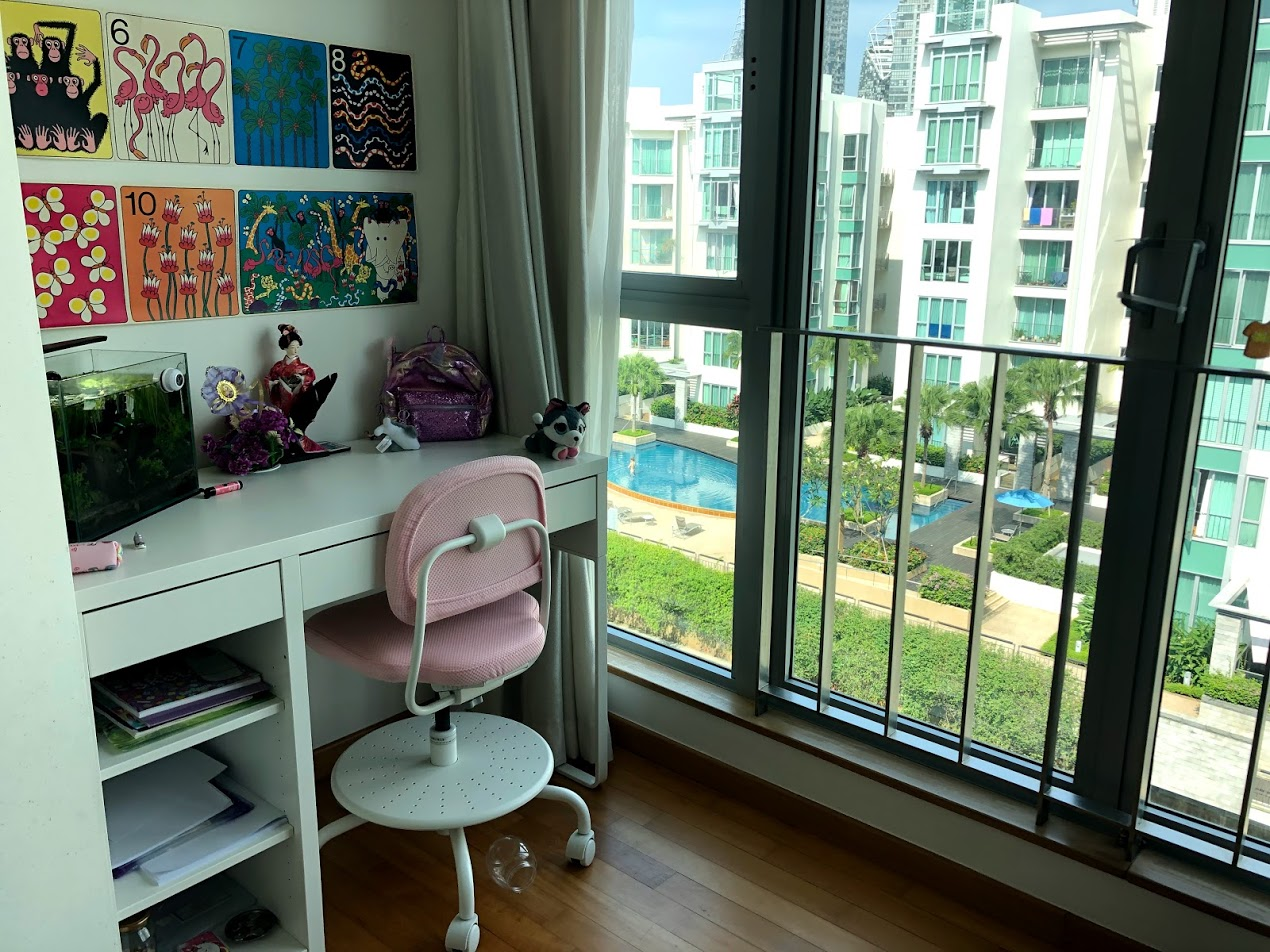 We had to reorganize the room, but we did fit a desk in her bedroom. We also took the handle off the window so no one can open the window and fall out.