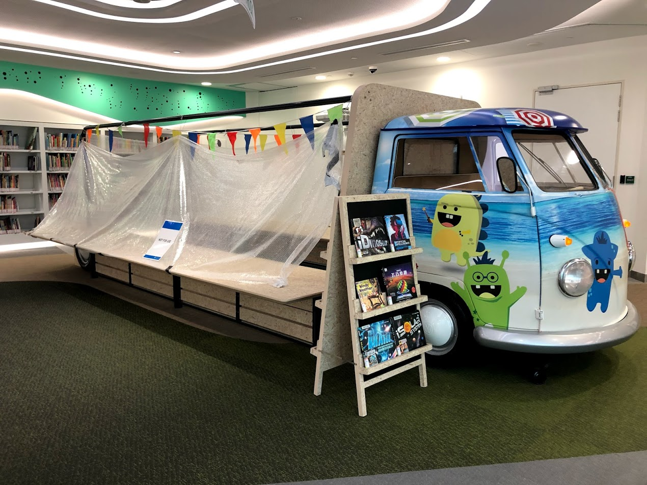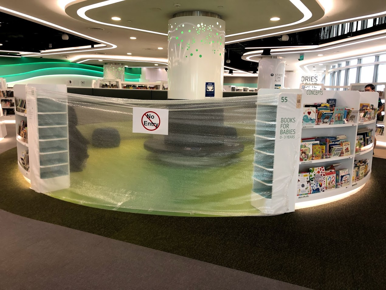 You're only supposed to stay for 30 minutes in the library, so they've removed anything that might allow you to linger. No seating, no tables, no playroom. I sat on the floor to sort the stack of books to make sure I didn't have more than my limit.
