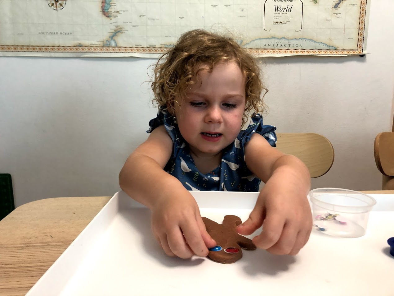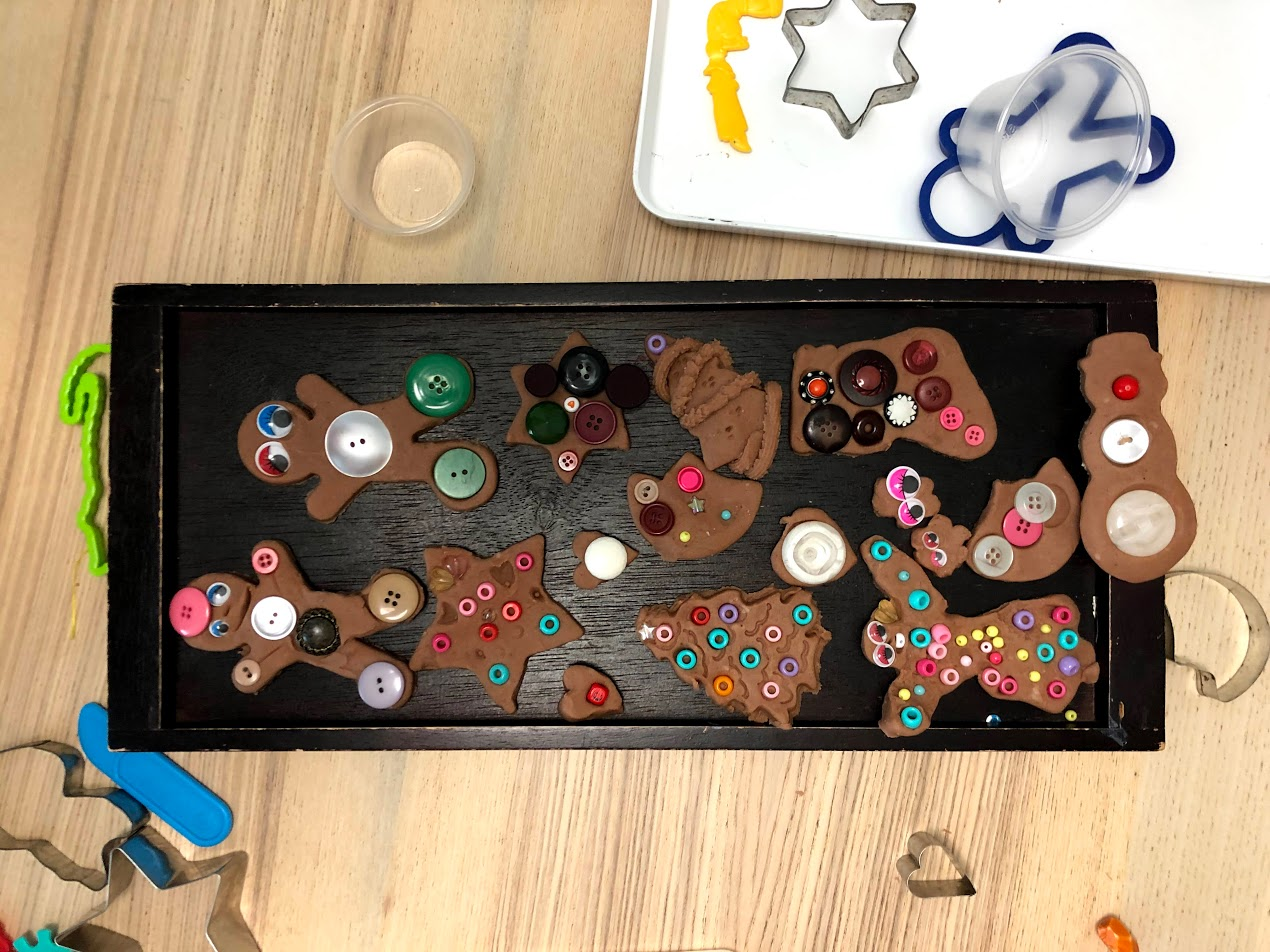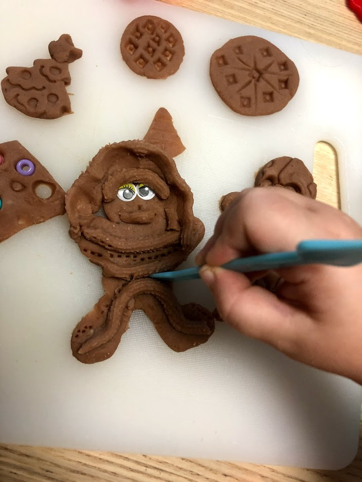 We had decided we were going to make Gingerbread Men with our playdough, so I added 1 tbsp cacao powder, 1/4 tsp cinnamon and 1/8 tsp nutmeg before I cooked it to make it the right colour and scent. Beads, googly eyes, the playdough tools and the Christmas cookie cutters completed our set up. The scent was lovely. It wasn't overwhelming, but if you warmed it in your hands the scent got even stronger - like freshly baked Gingerbread.