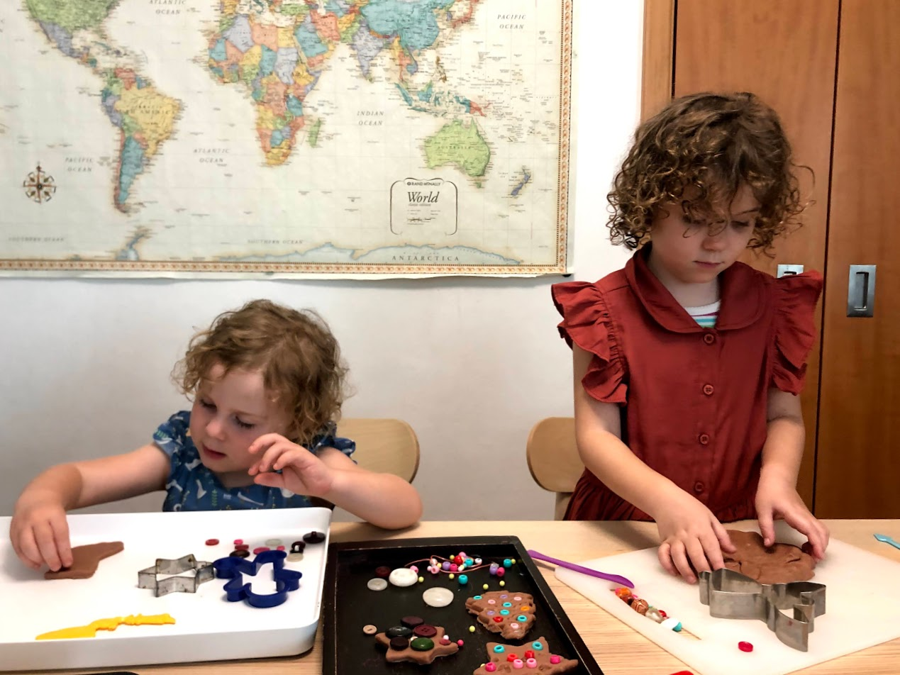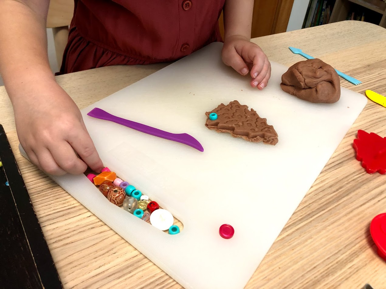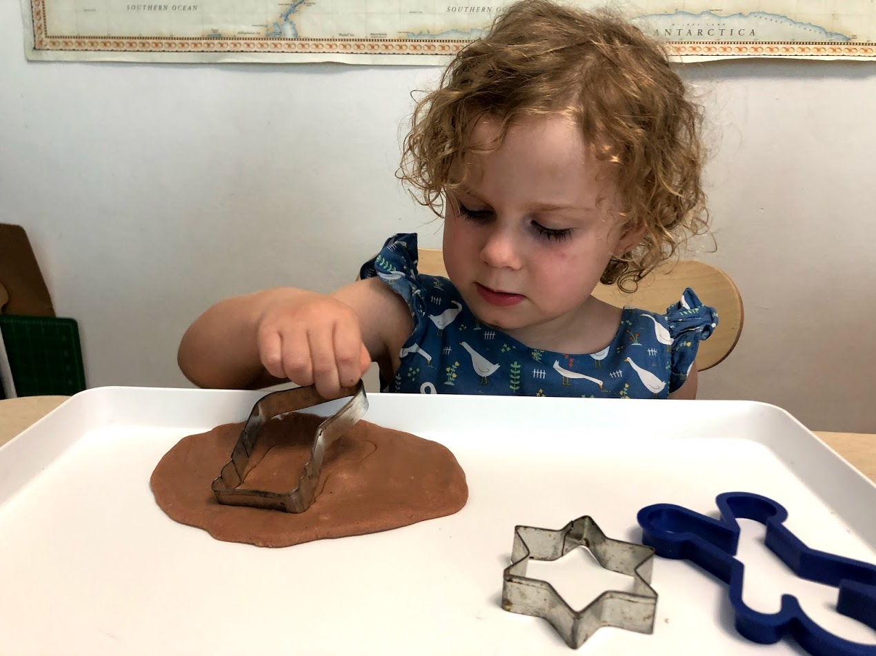 We had decided we were going to make Gingerbread Men with our playdough, so I added 1 tbsp cacao powder, 1/4 tsp cinnamon and 1/8 tsp nutmeg before I cooked it to make it the right colour and scent. Beads, googly eyes, the playdough tools and the Christmas cookie cutters completed our set up. The scent was lovely. It wasn't overwhelming, but if you warmed it in your hands the scent got even stronger - like freshly baked Gingerbread.
