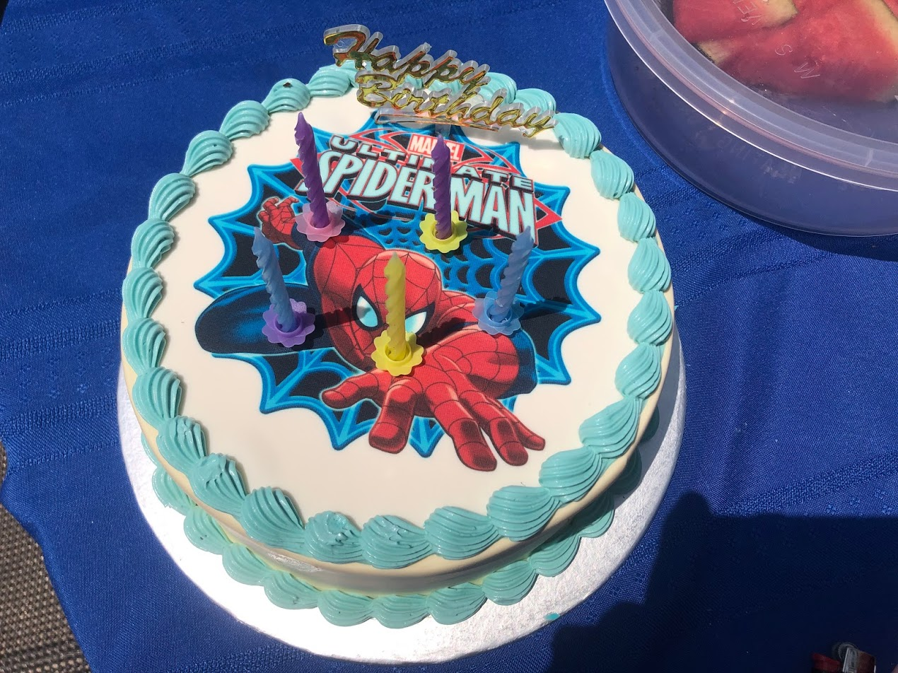 We had 6 kids in total (3 guests). Even with staking out 2 tables by the pool at 7:15 in the morning, this was the easiest party we've ever hosted. I took Ms.I out and decorated while she played on the playground beside the pool. I saw another birthday party setting up on the side pool on the other side, so around 7 am was the right time to be grabbing a table. We could have reserved a Barbecue pavilion and it's tables, but we really didn't need it. And I imagine they would have been hard to get right now as the Club House which is often used for parties is closed right now getting new air-conditioners. After setting up we went home, had breakfast, made up a fruit salad, sliced some watermelon, grabbed our picnic basket and swim bag, and skipped down to the pool for the party.