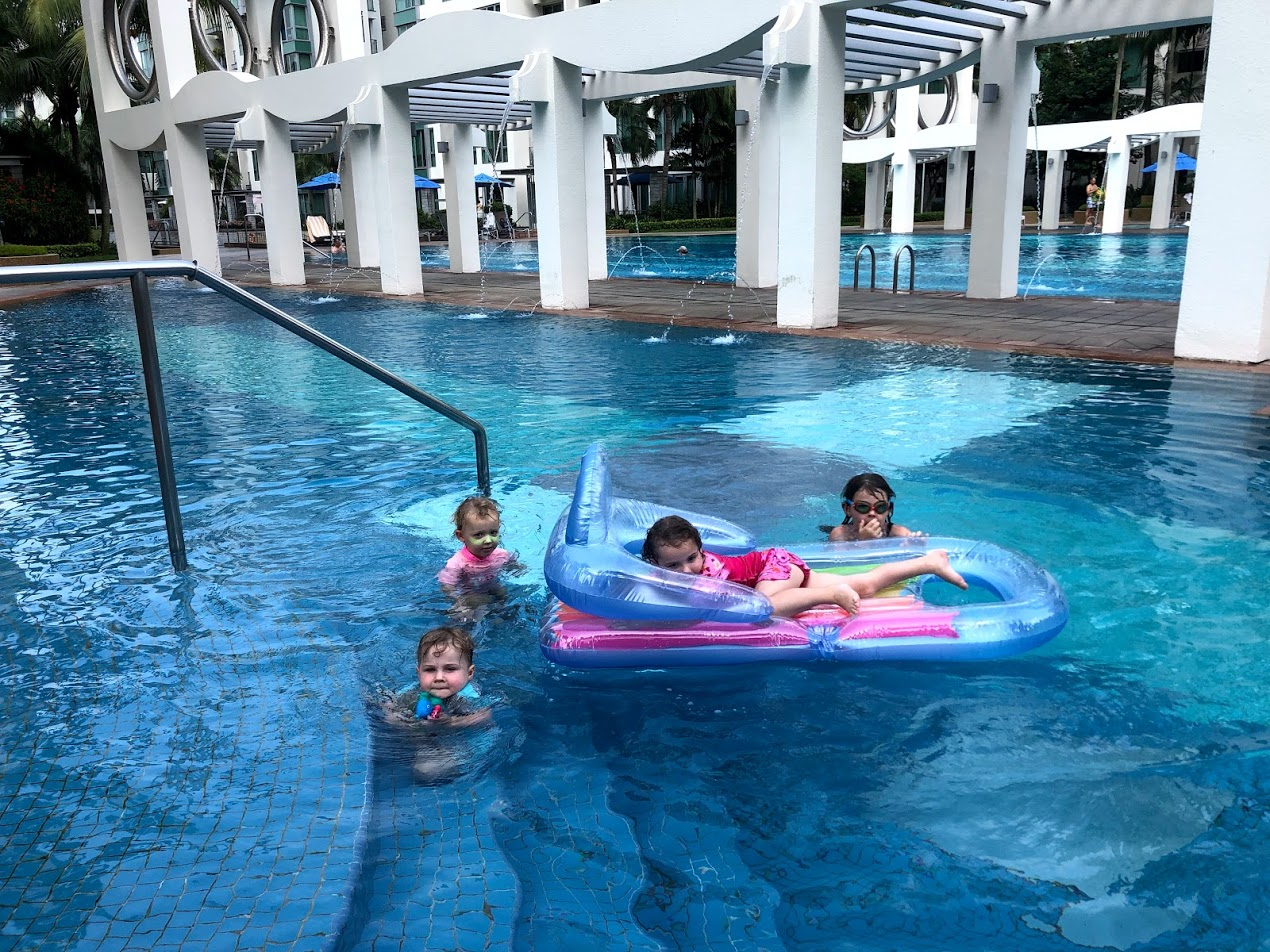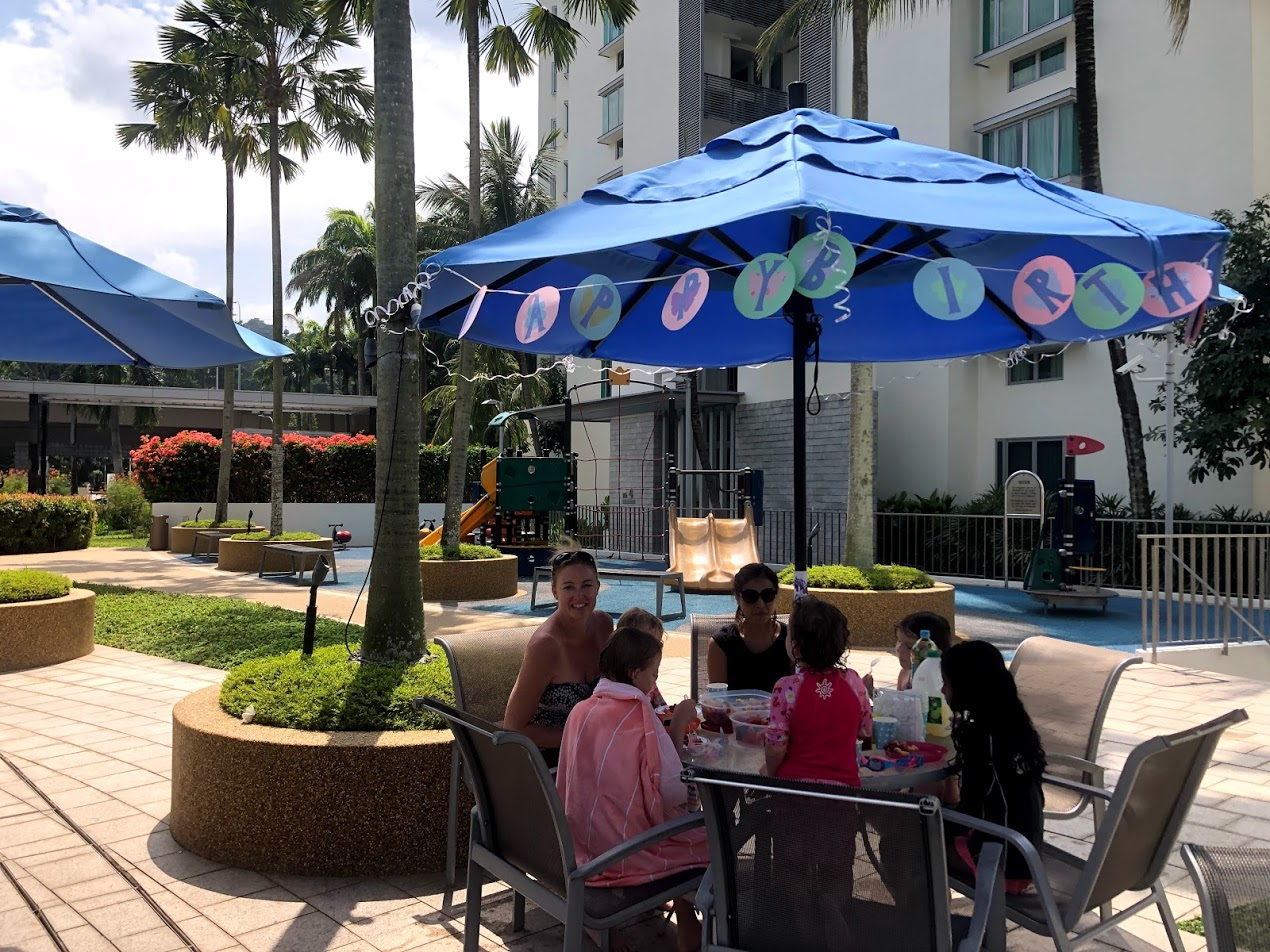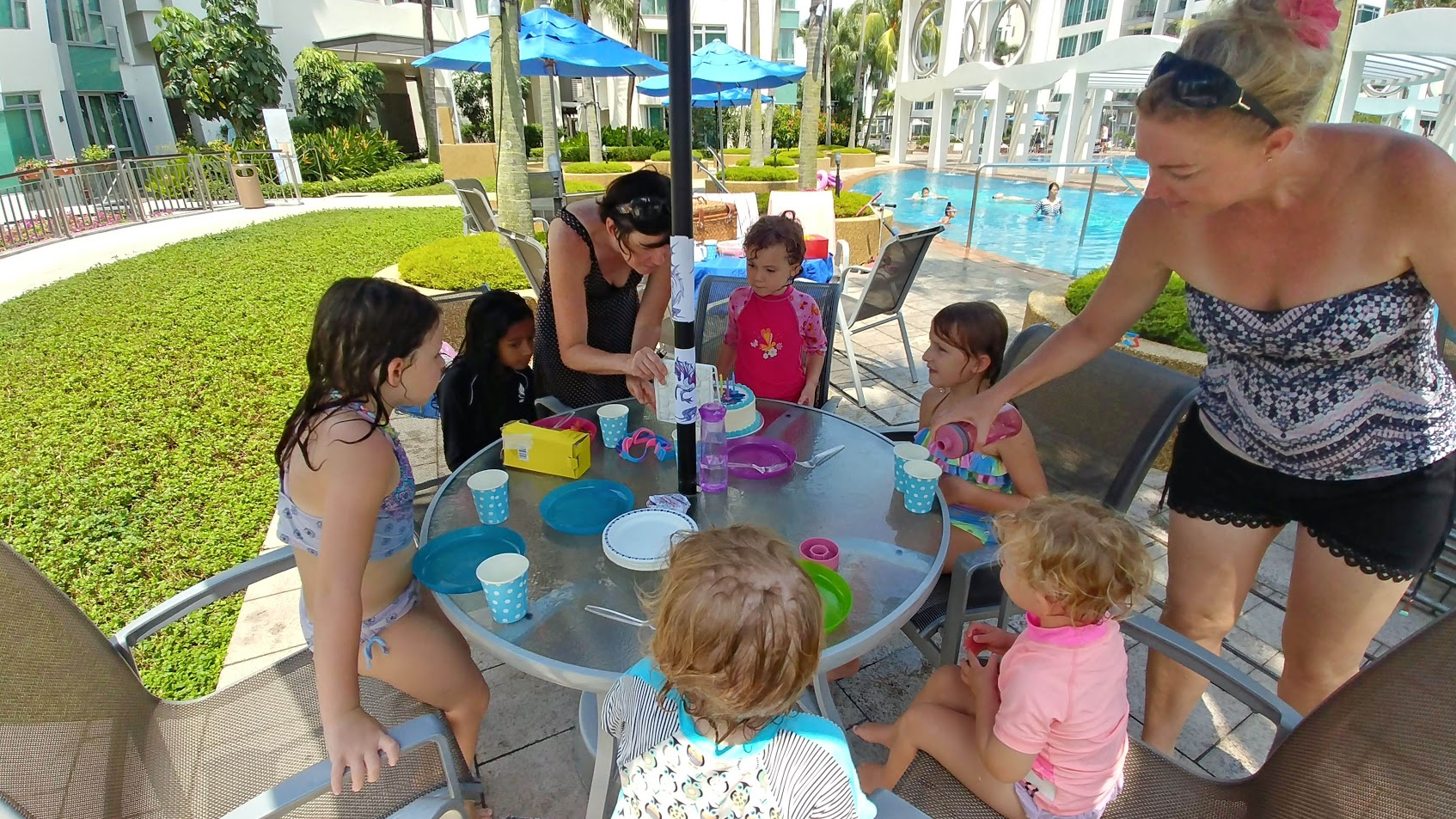 The night before Ms.E's pool party, we found a $21 birthday cake. A 10:30 swim and then fruit, cake and cookies was perfect. The music from the aqua-fit class in the main pool added a fun vibe, and there was still a little bit of shade in the side pool. It's hardly ever windy in Singapore, but the nice light breeze this morning meant it took a while to get 5 candles lit. We had a hurried birthday song.