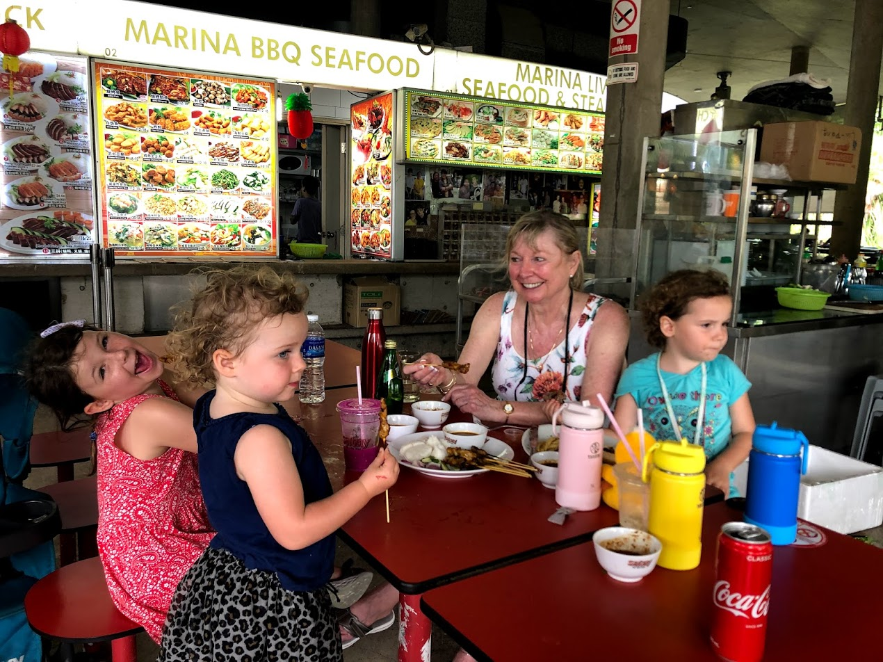 Above February 24: Our last Hawker Centre Meal: The kids and grandma and I. We wiped everything down and gave our hands a thorough scrubbing before we sat down.