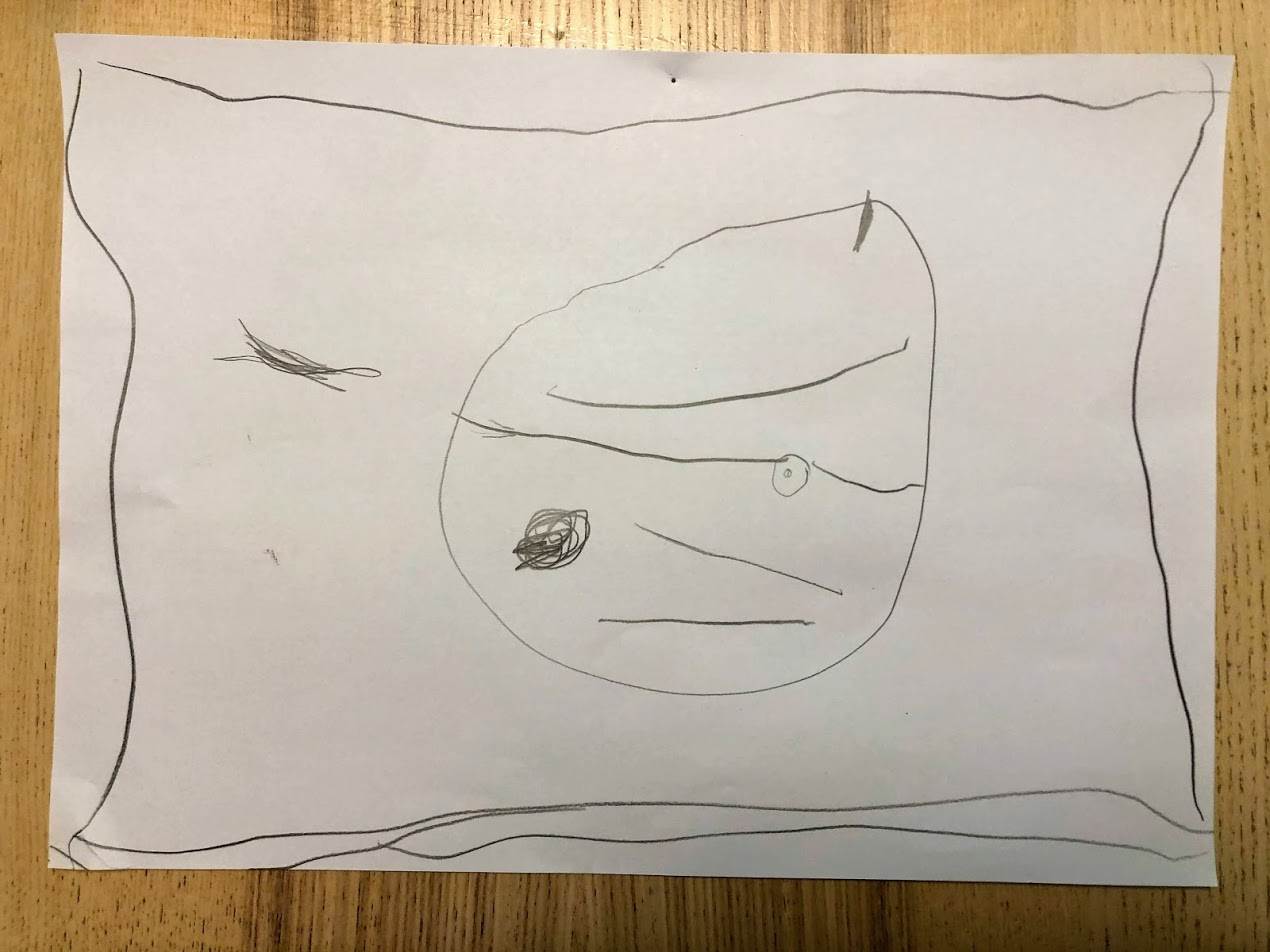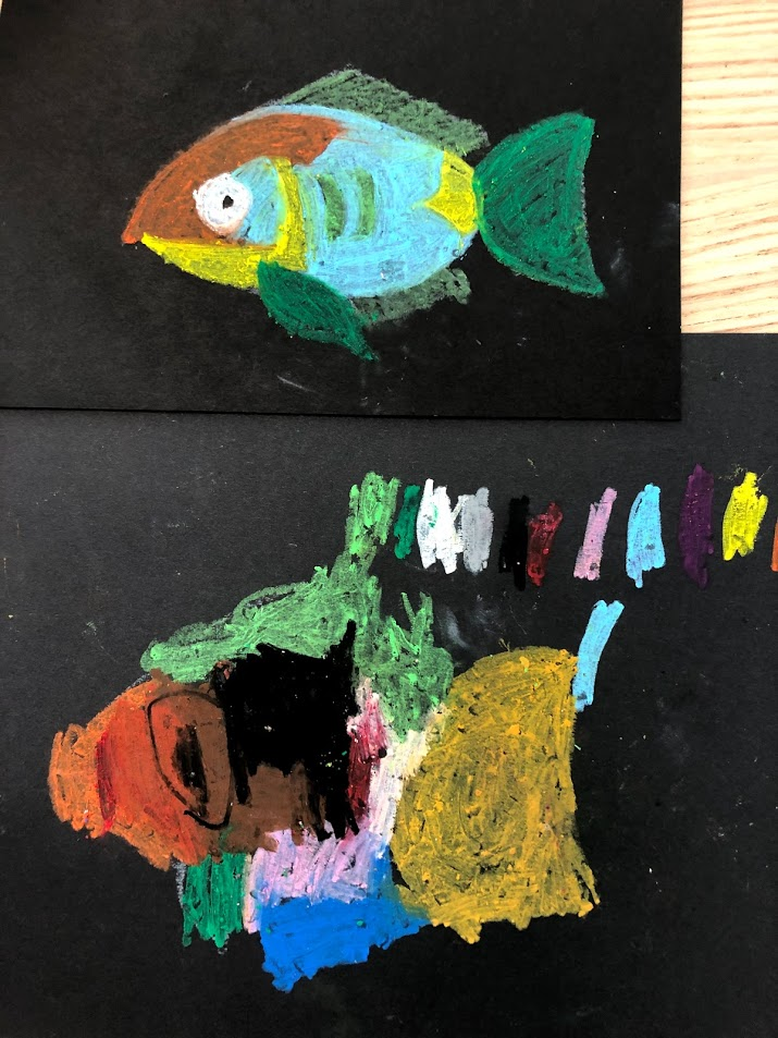 When I pulled out pastels the other day, MsI started by testing out all the colours in a row, then she asked me to draw her a fish. I drew us each a light outline. She chose to colour her fish on her own in a way very similar to mine. My only suggestion to her was did she want to add an eye and below is what she came up with. Then she drew a fish herself the next day in pencil. She wan't impressed with it, but I was. There's a white eye, stripes, the black fin and I'm pretty sure the black lines to the left are the tail. She's also drawn it in an aquarium.