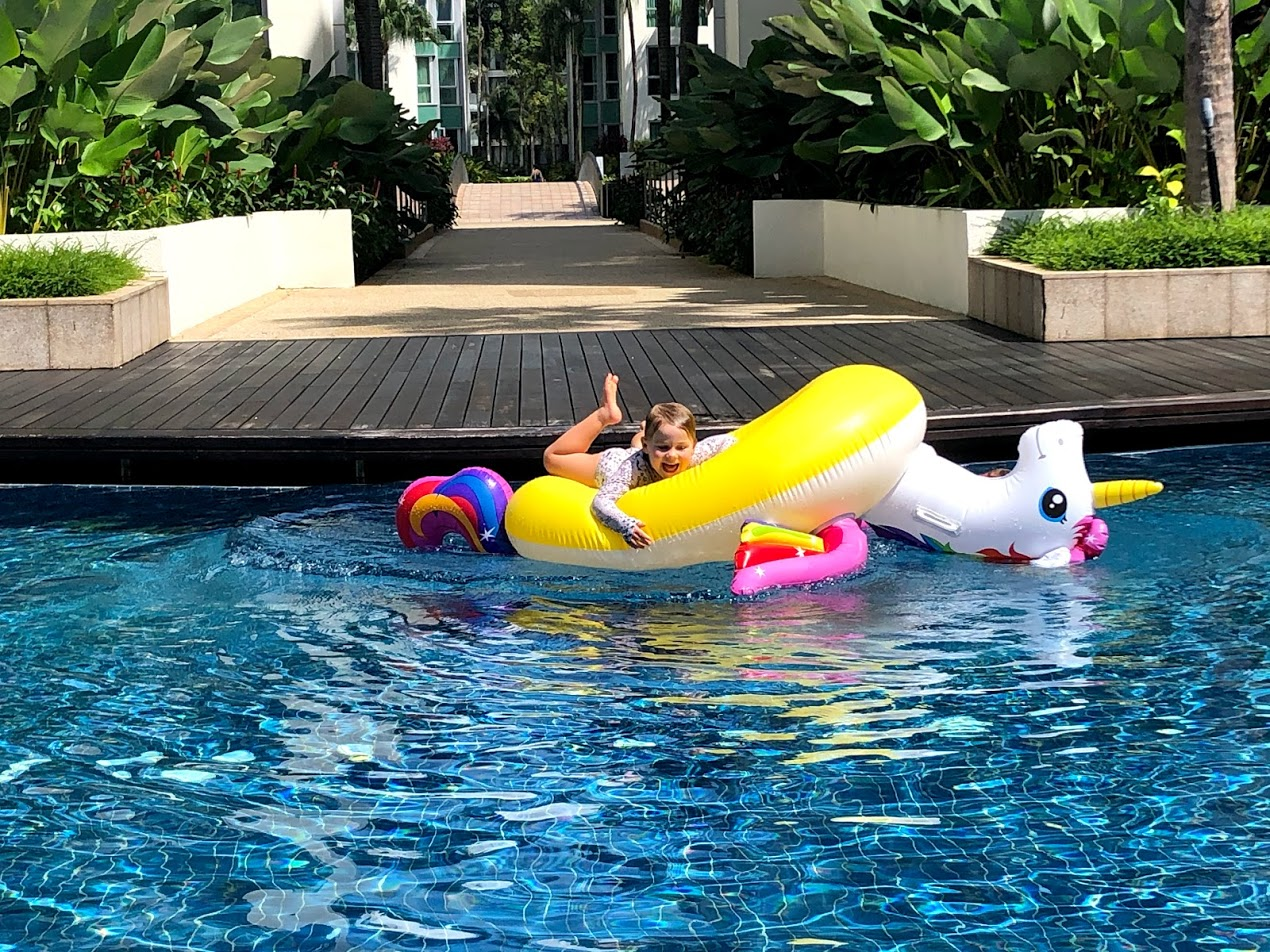 MsI goes swimming every morning so she is a super solid swimmer. She likes to ride unicorns, even when they're upside down. We bought her a snorkel mask; she's too small for the breathing tube and fins, but she's figured out that she can float and look at the bottom of the pool for a long time.