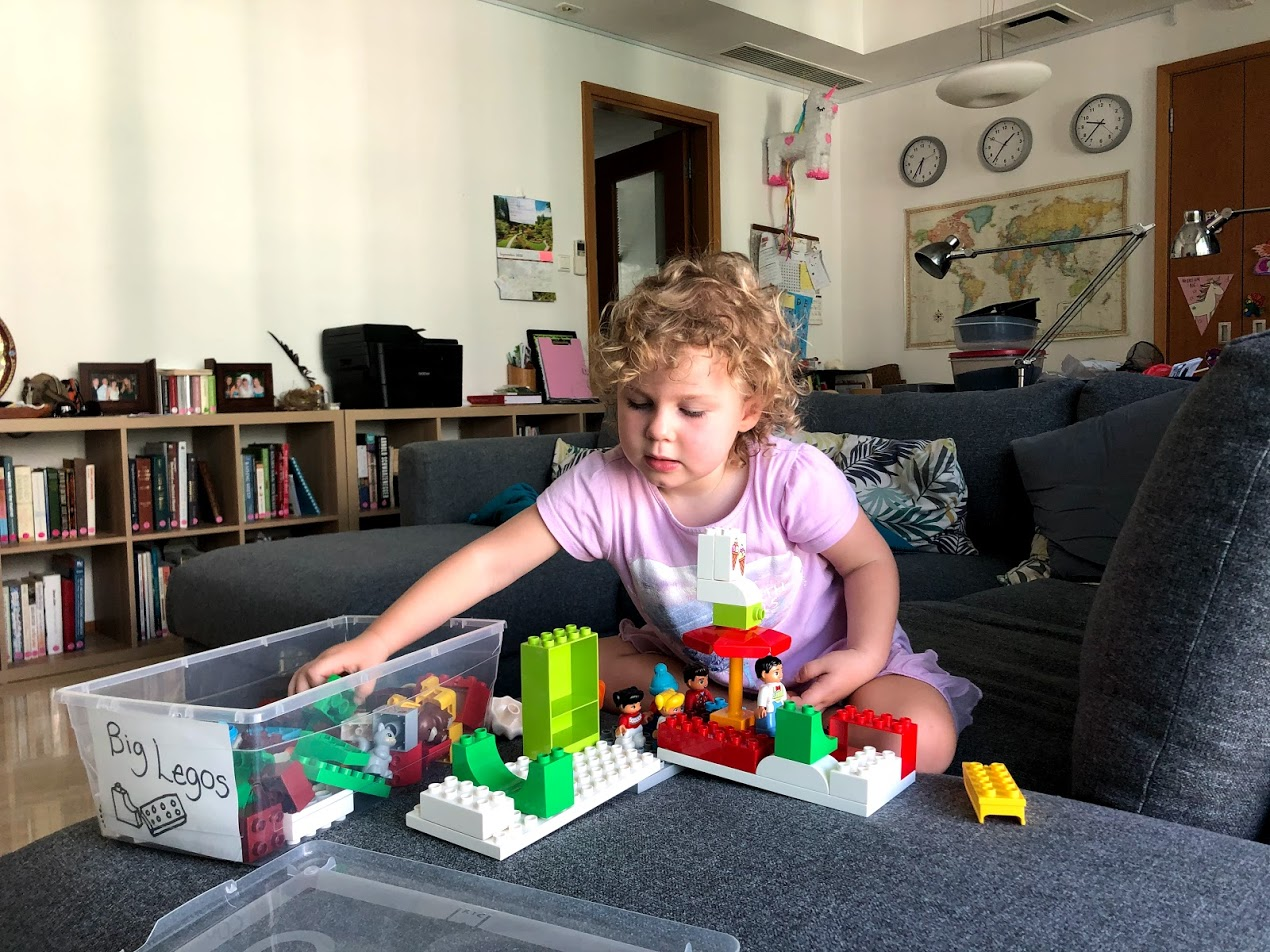 She loves Lego Duplo sets and will use the the tiny lego too. Her play has become quite elaborate and usually includes dinosaurs, dragons, little people, and the bunnies or other little animal figures all together in some big scene usually with a house of some sort. We have to lie any animals left out on her play table down to go to sleep before MsI will get into bed at night.