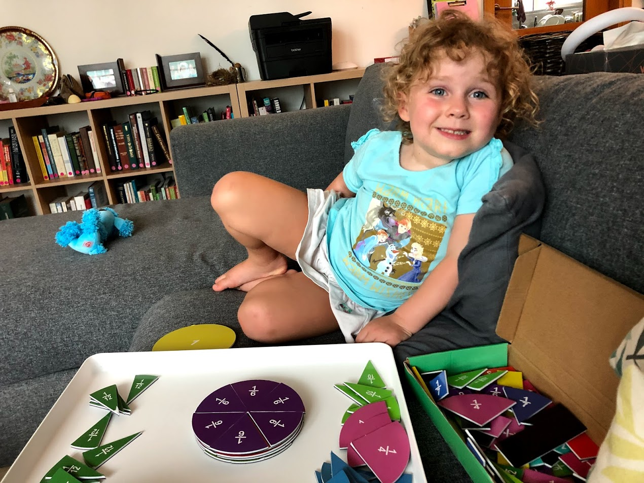Another favorite puzzle problem of MsI's is our Fractions set. The circle or fraction line will not line up properly unless only equivalent fractions have been used. Sometimes she uses all the same colour like in the picture below - six 1/6th pieces make up the whole, but sometimes she will use the different colours patiently trying until the equivalent fractions match up.