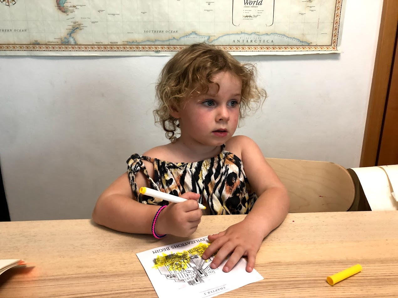 She's just turned 3, but she figures she can do anything her big sisters can, and she so she does. She takes herself to the table anytime the girls do. She listens along to all our read-alouds, joins in all the art, pulls out a workbook when the others do.