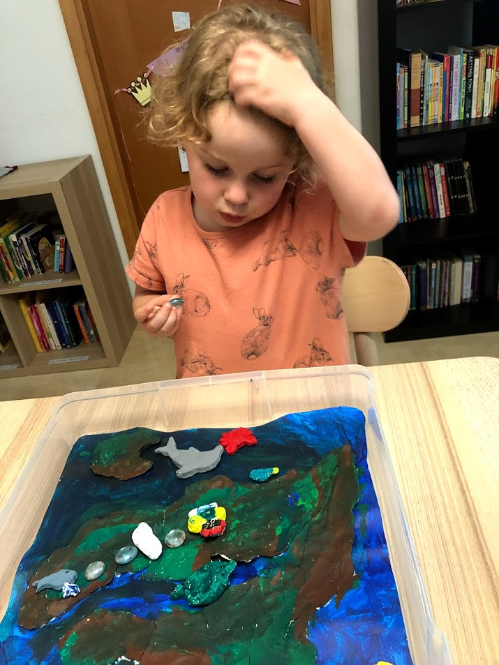 Below she's playing with the island we made to go along with our read-aloud "My Father's Dragon." I should really add a dragon, but we haven't quite gotten to that part of the story yet. She helped make the clay animals, and loves play dough.