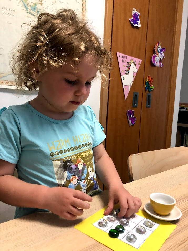 When we played Geometry Bingo, she knew the names of 2-D shapes (circle, square, triangle...) and the repeated names of the 3-D shapes after us. MsI counts everything. She's working on getting her teen numbers straight.