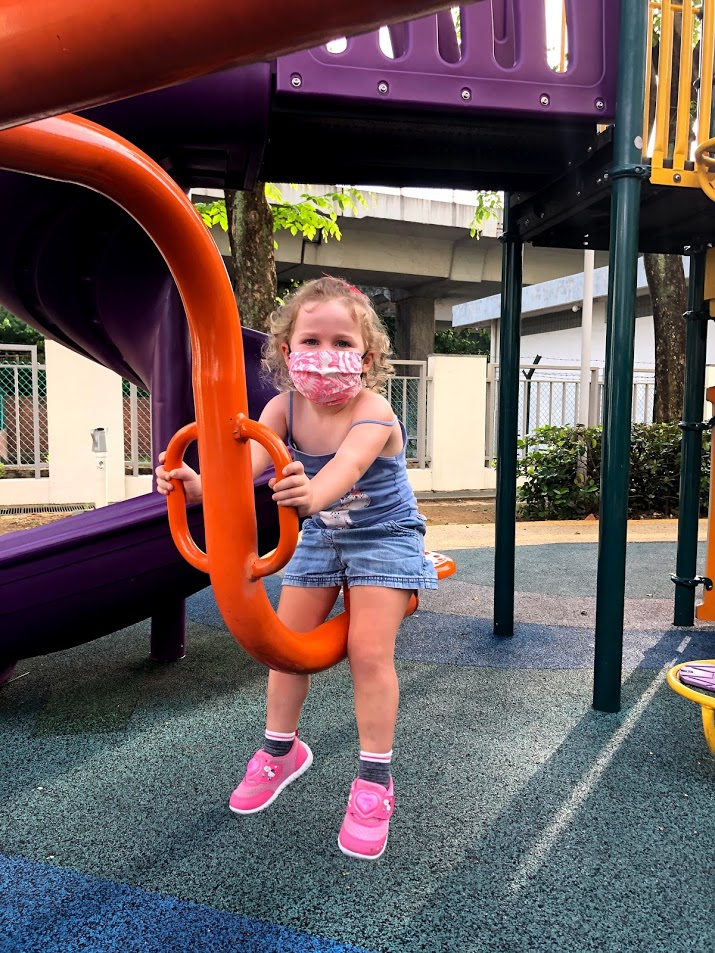 On the playground she is still wary of kids getting too close; That's a hang on from being told to stay arms length away from people during lock down. She won't play with any of the kids her age, but likes to chase after the 8 and 9 year olds her sisters play with on the playground. She's not as strong as she was before lockdown so she slips from the climbing vines more easily than before, but she goes out to play most afternoons and is fearless.