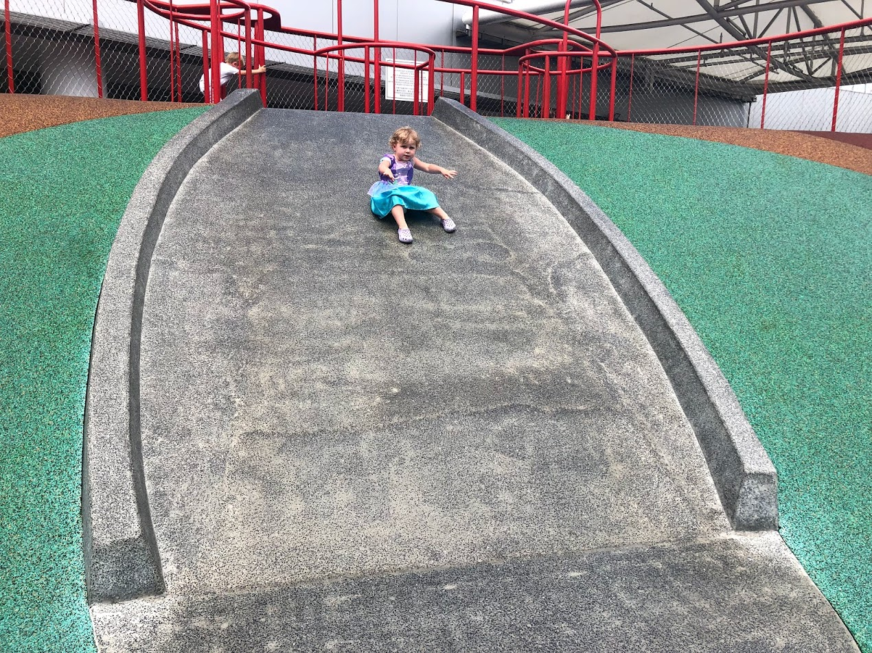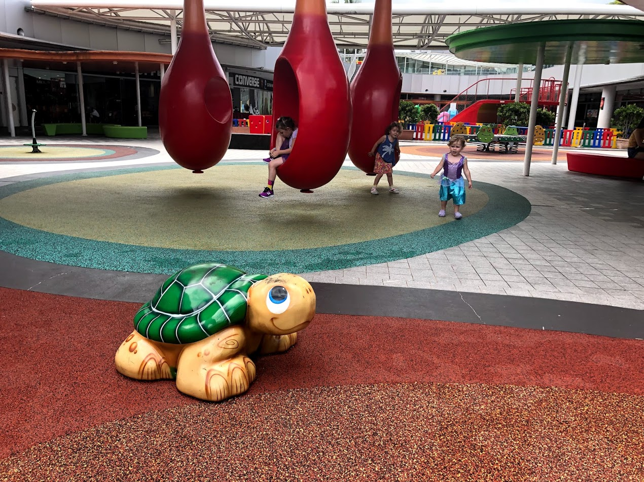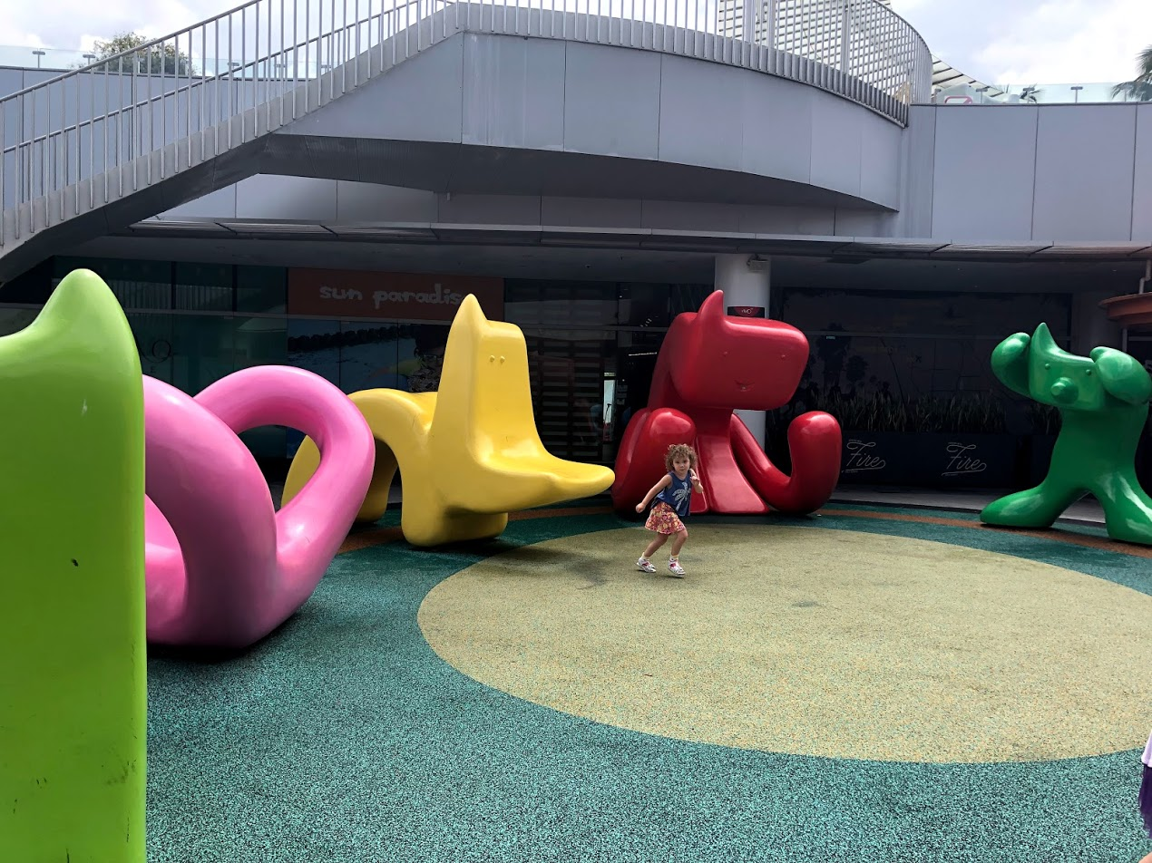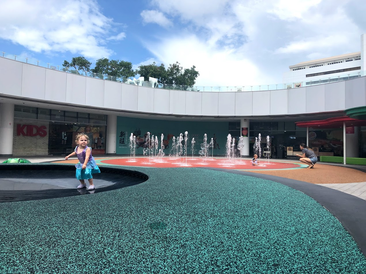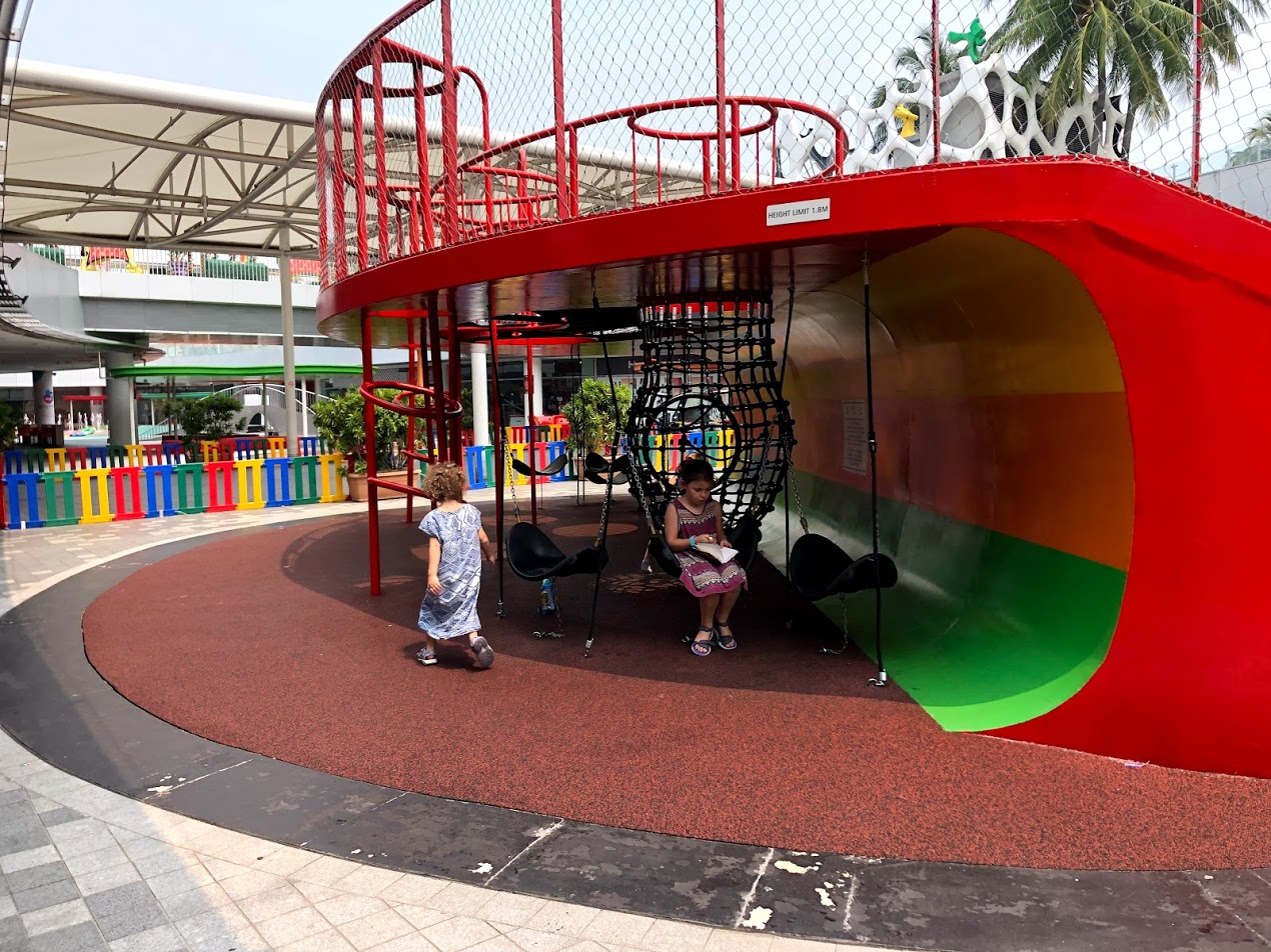 In the Autumn in Canada, I get my Starbuck through the Drive Through, then we head to the local park. The kids groaned when I said I was grabbing a latte; but no Drive Through was required here, and we were in VivoCity Mall so the park was just through the door. It's in the Mall's outdoor courtyard - centre of the mall on the 2nd floor. I actually sent the big girls out to start playing while I waited for my drink to come up; I could see them through the window. Concrete slides, climbing structures, swings, teeter totters, some trampolines, 2 different aged play zones, shady seating and a fountain to splash in. This playground is pretty deluxe.