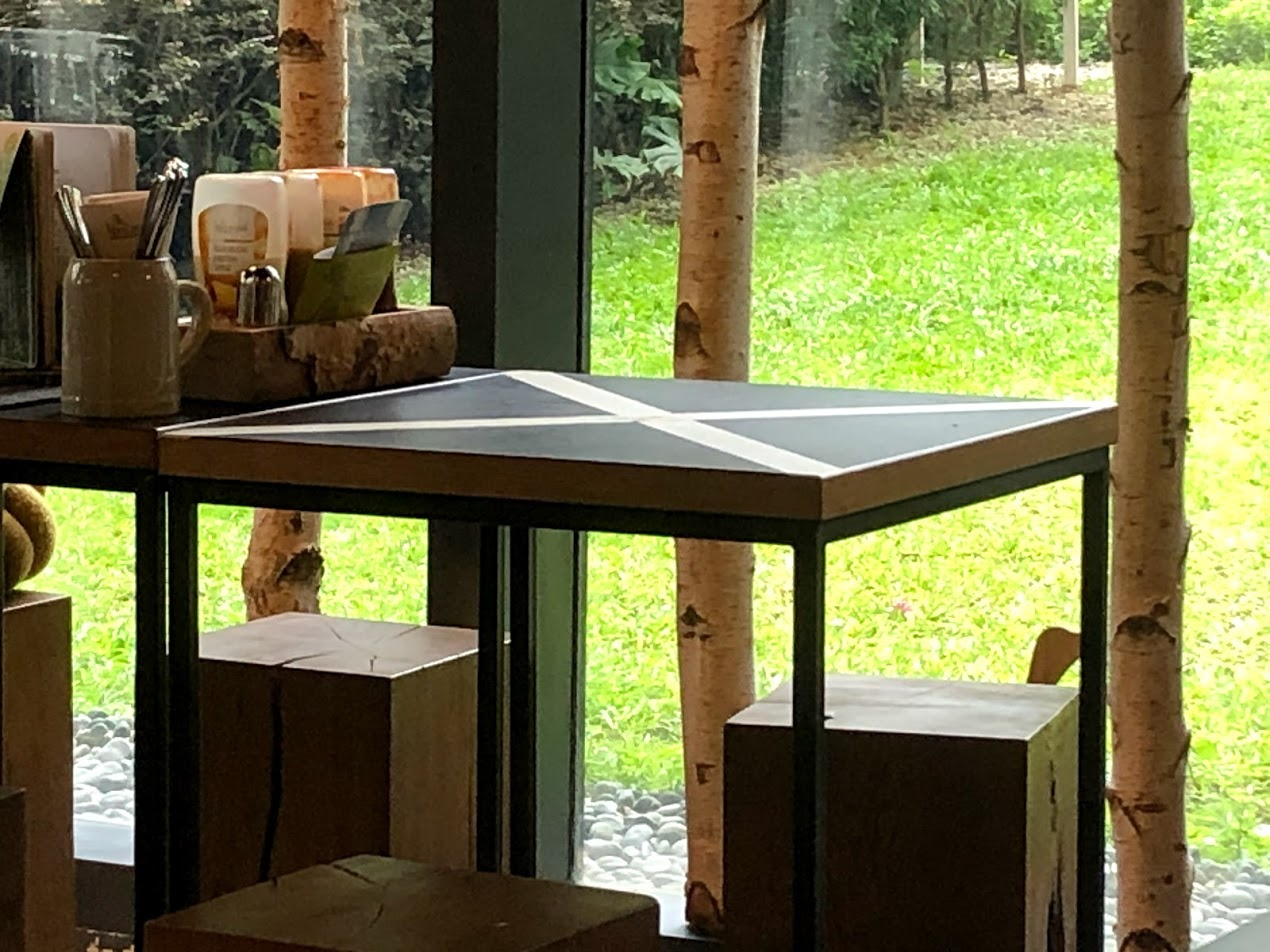 Because our babysitter was costing us $86, we figured we'd better use all our time and sneak in lunch together. At the restaurant before we could be seated, we had to scan a QR code with our phone, enter our personal information for social tracing, be temperature checked and given our "registered" sticker. Then we were seated at a table without an x. Seating has been drastically reduced to align with social distancing measures. Also the restaurant was almost empty.