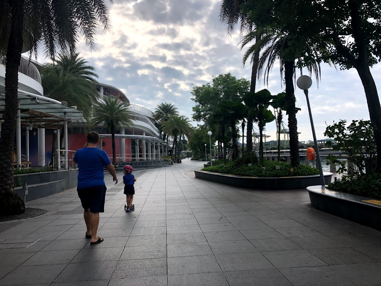 We decided to a walk the Boardwalk along the Harbourfront. This foot path goes from behind VivoCity Mall to Sentosa Island. The mall wasn't even open yet, so it was - as expected - quiet. A few people sitting alone with a coffee, a few walkers, one family with kids on scooters like us. We passed a food cart with a sign saying, "Remember the Good Old Days,".. we laughed and said, "yeah, like last month, or last year".