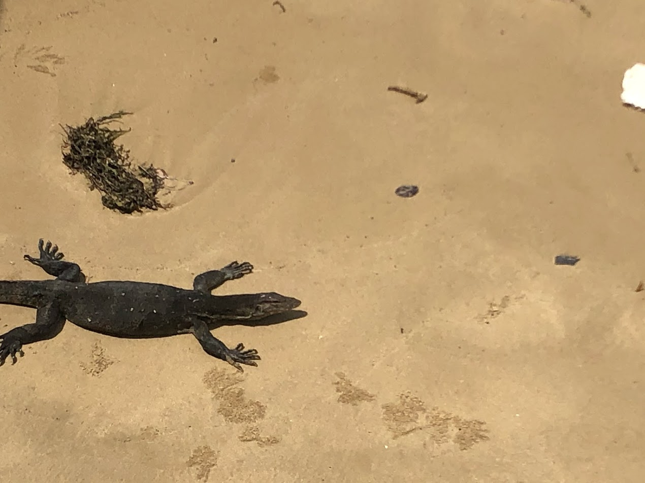 It was low tide. MsE spotted a monitor lizard as we were leaving the Boardwalk. We watched him long enough to realize that he had made scratches in the sand all the way up the beach with his long claws. He had obviously been walking up the beach a long way. After a while the monitor lizard wandered off under the Boardwalk where we couldn't see him and we got to see him walking.