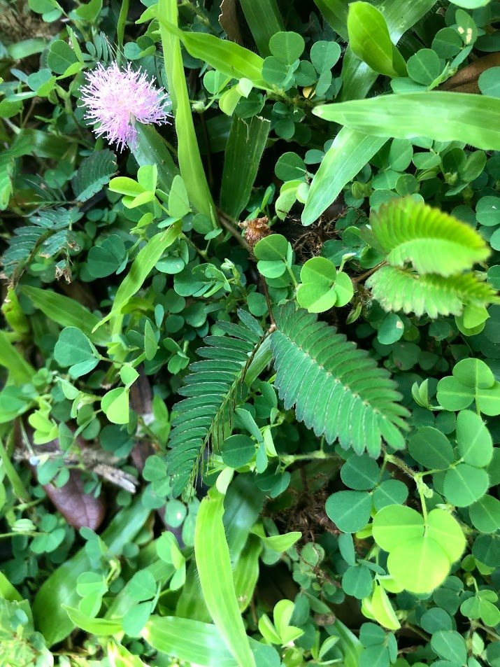 Despite the Red Tape we saw so many birds: yellow Orioles, black mynas, a variety of doves, and the plentiful jungle fowls. The songs were beautiful. Our Helper has been coming on walks with us. She showed us how these tiny ferns about a finger length long in the grass that pull their leaves in if you touch them. She said, "They go to sleep." The girls were thrilled and tried identifying and putting the plants to sleep over and over again.
