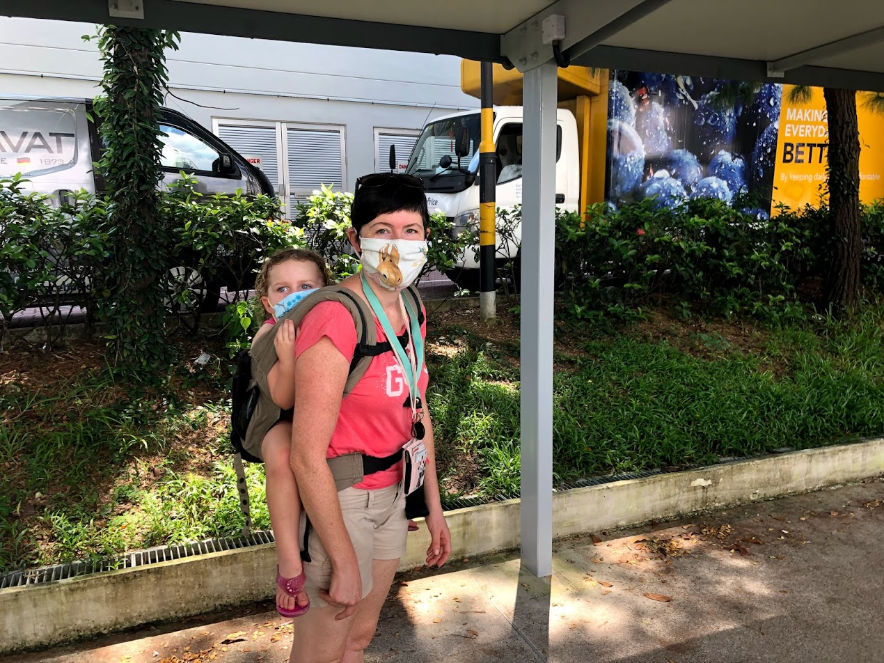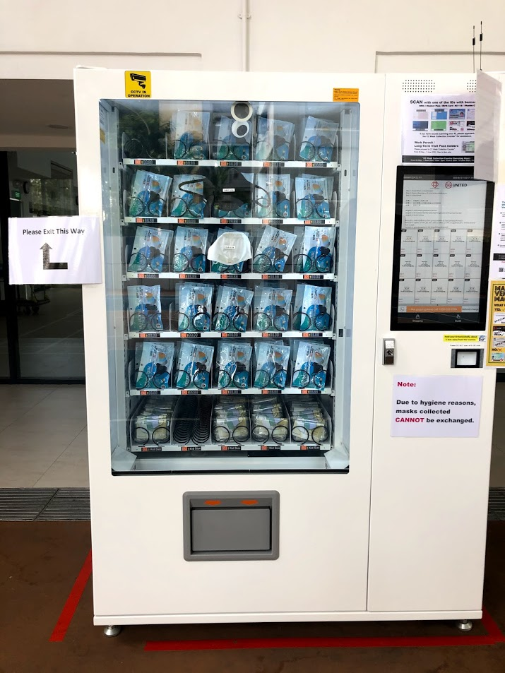 Mask collection was from vending machines. We had to scan our ID cards. There were child sized ones too, but we couldn't get the kids' ID cards to scan. We noticed the sign on the machine saying Work Permit and Long Term Pass Holders (a.k.a. our family) may have scanning problems. We talked to the person at the desk and they were able to unlock the machine and hand us the kids ones. In terms of size they fit MsC, but were too small for me and too large for MsE and MsI. The kids ones do seem easier to breath through, which is good because that is MsC's biggest complaint.