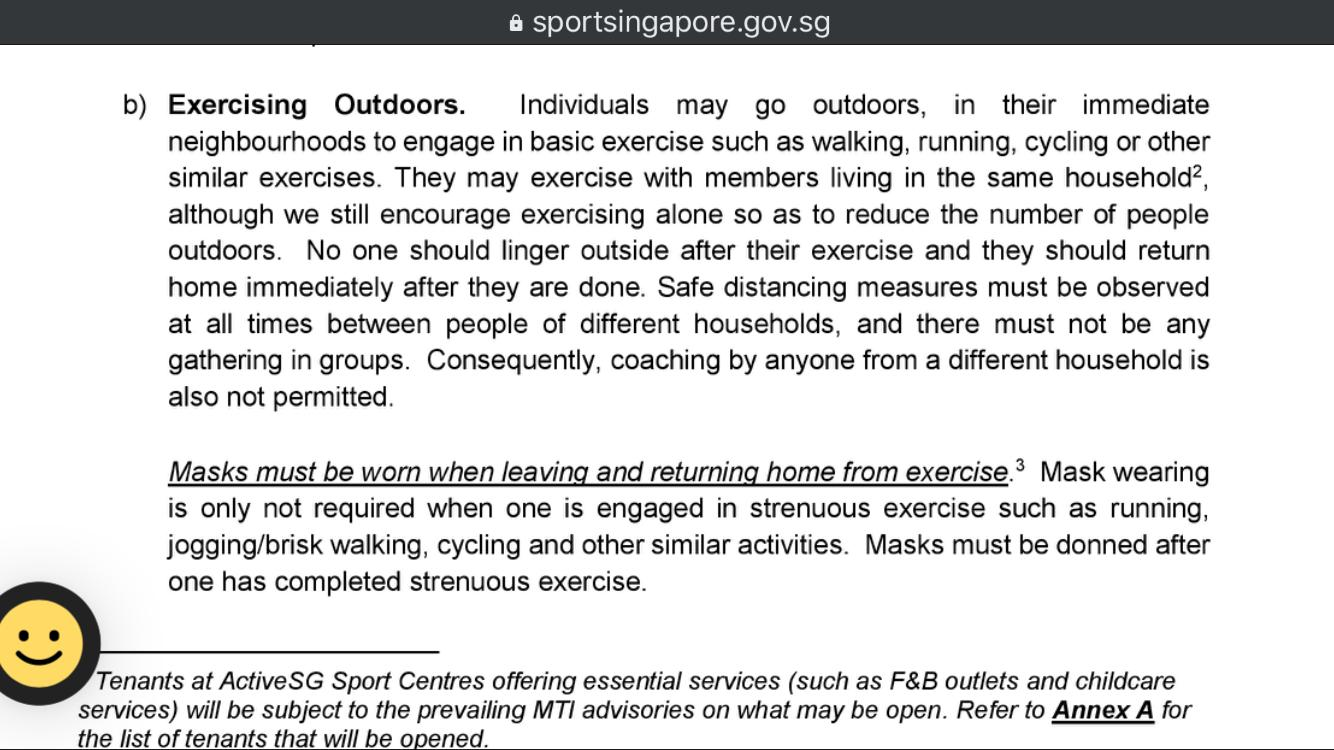 Buried in the Sports and Rec information, I finally found the spot. "They may exercise with members living in the same household." Until recently that said, something like, Exercise alone.