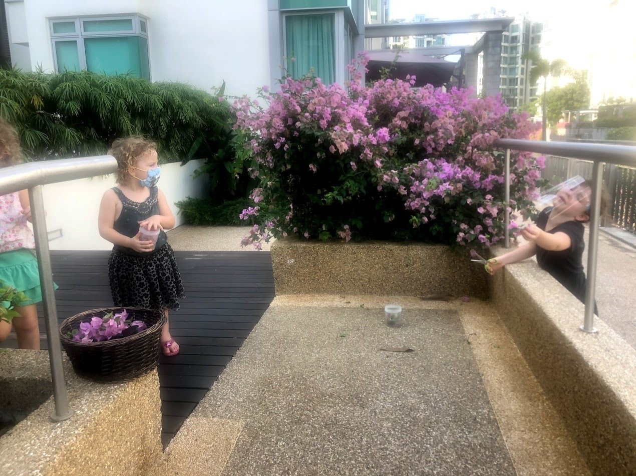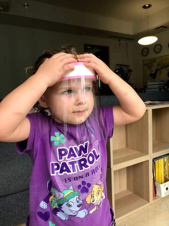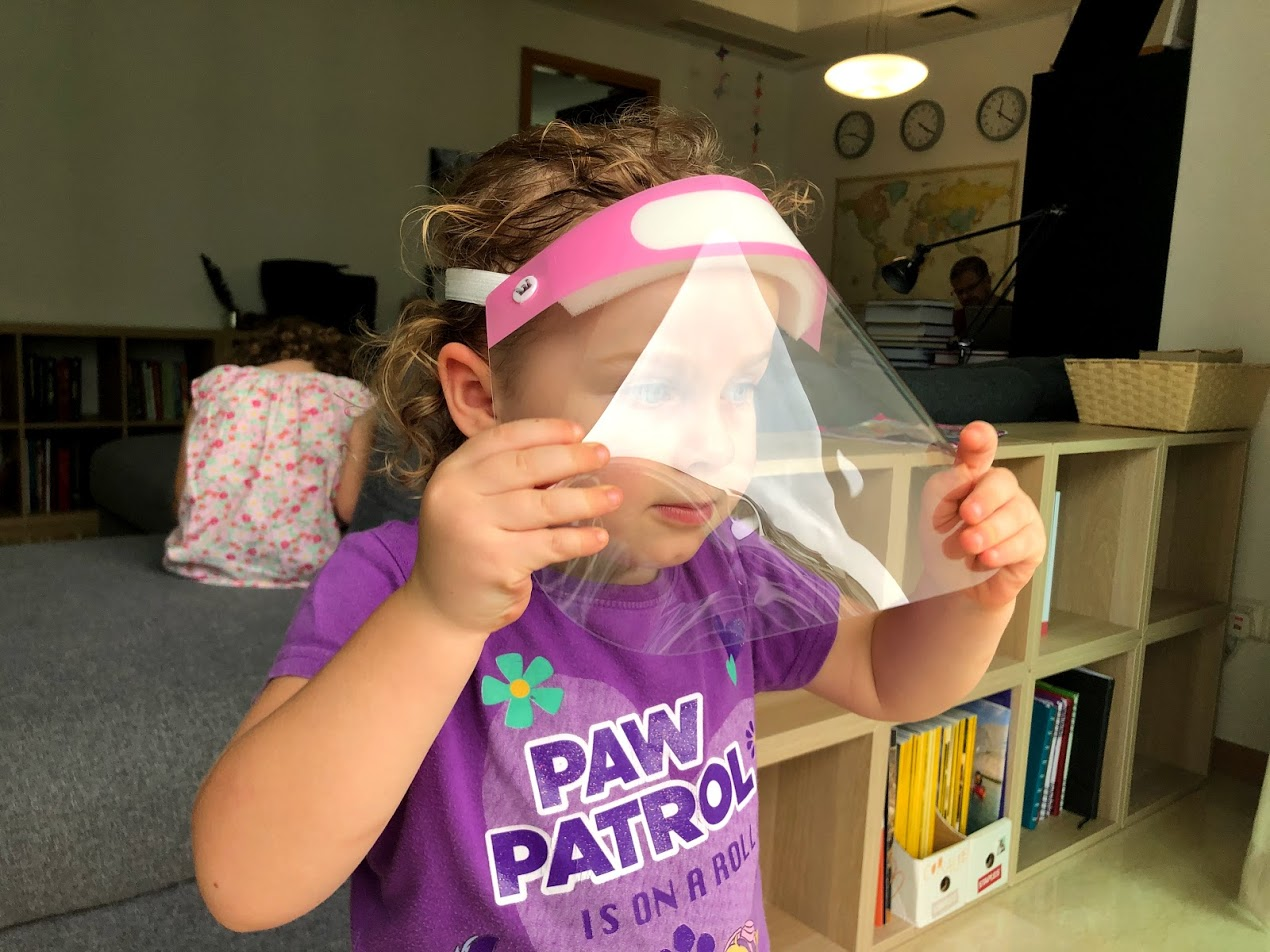Now that Singapore kids (not ours) are back in school, kids are now allowed to wear face screens without masks. I picked some up at the grocery store. MsC is technically an adult one. She is worried that she looks weird, but she says at least she can breathe. It sits on clear glasses - we should be able to change it out for her sunglasses if she wants. MsI doesn't like the new face shields at all.