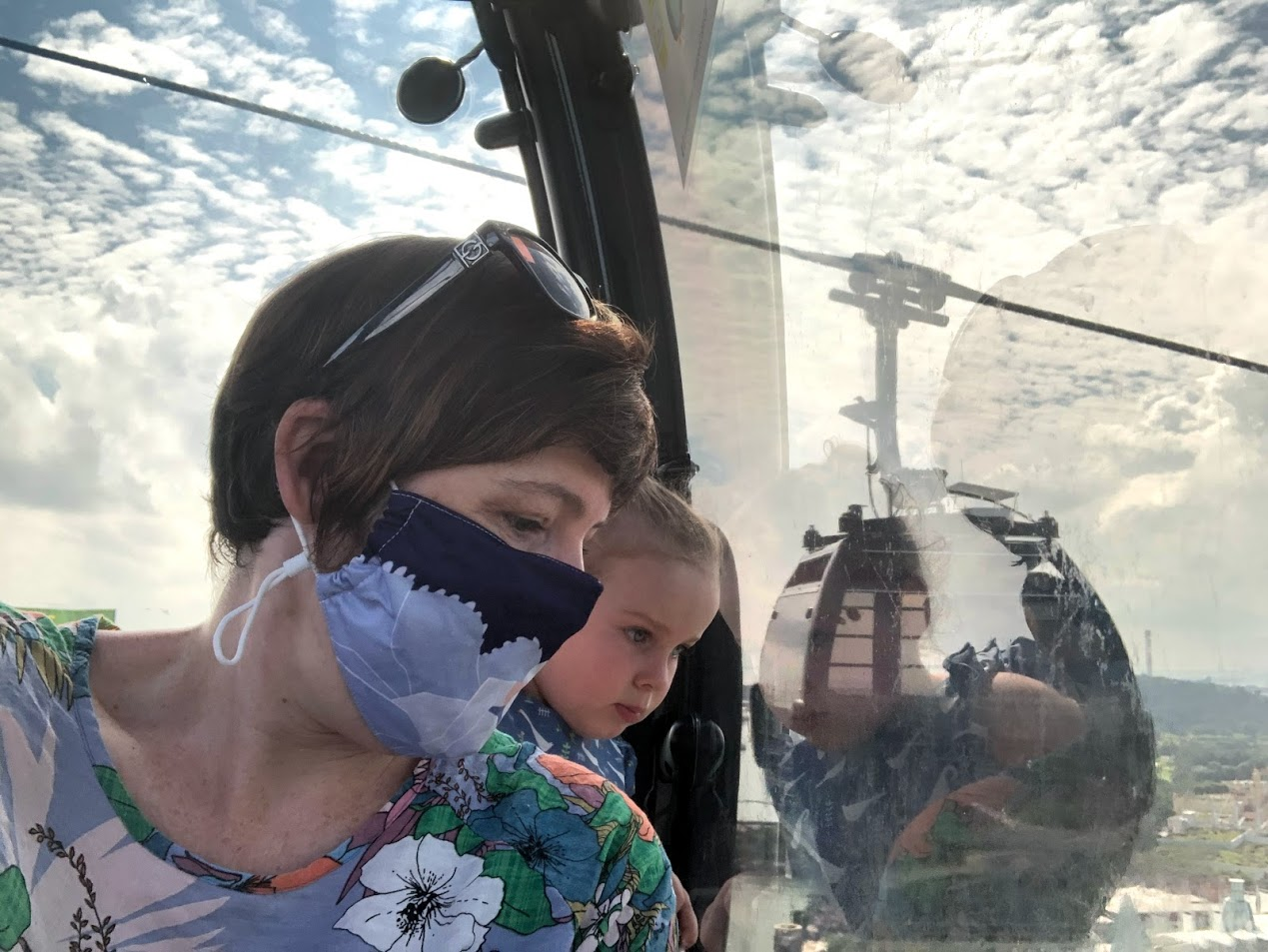 It had been quite a while since we had a cable car ride and she was a bit wide-eyed when the car began to swing freely. She held on pretty tight then, but then she got comfortable and wanted to know where the dolphins were. We always look for the dolphin tanks that the cable cars go directly over.
