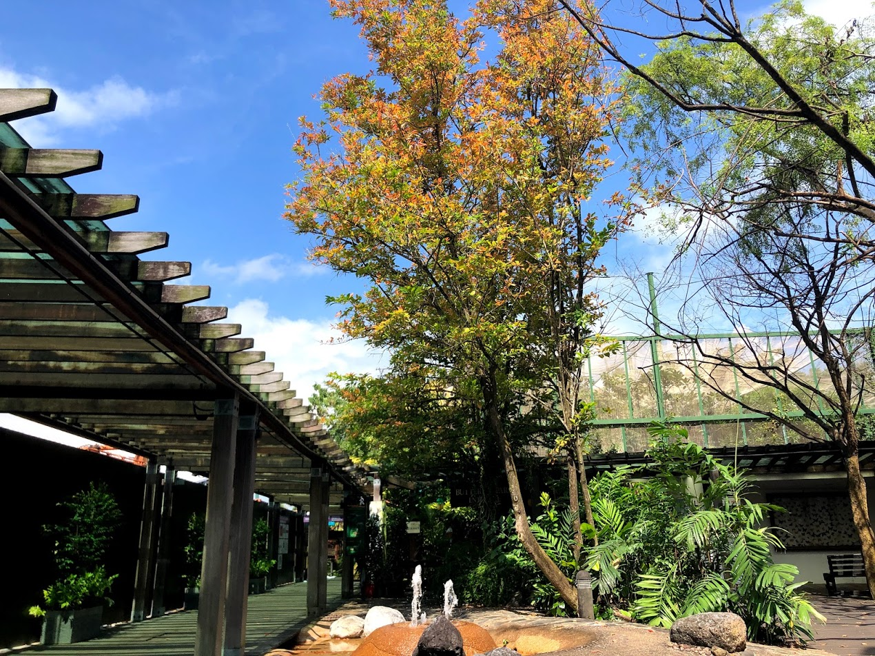 The first thing MsI did on Sentosa Island was to follow a large male peacock. He let us get within a few meters of him. After that she pointed out "the orange flowers in the tree." They weren't flowers, but actually leaves changing colour. These weren't true autumn leaves. In Singapore the leaves turn orange and red, and fall off the trees when there isn't enough water. We noticed this last September and October too.