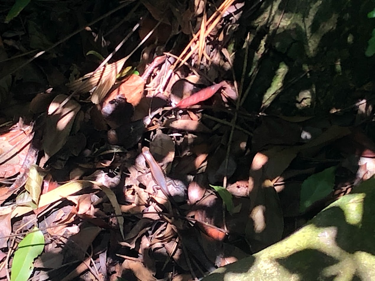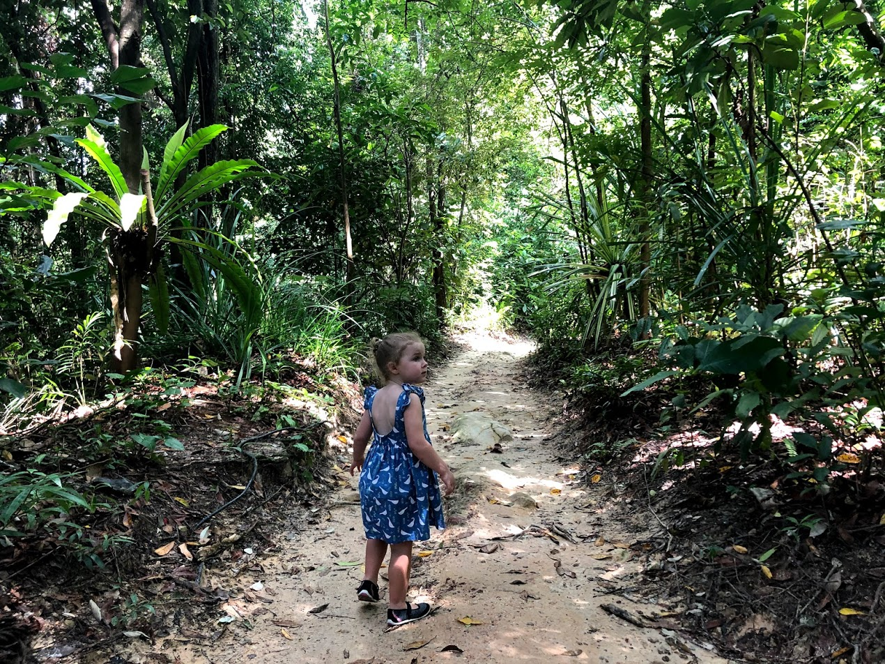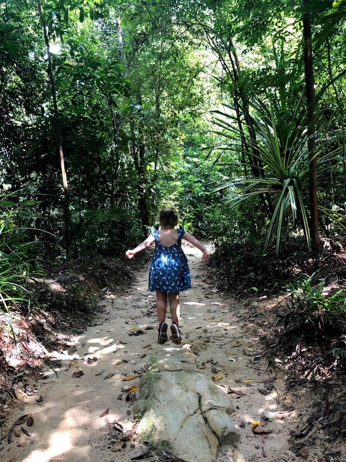 After the Nature Centre we layered on our sunscreen and our bug spray and headed off down the nature trail, which started off as a smooth tree top walk. We heard the call of a large bird, but couldn't see it in the trees. We had a little snack of dried mango. When I asked MsI what to do if a monkey came, she showed me she would hide her snack behind her back. I told her to throw it to the monkey instead or else the monkey would come and get it. She ate her piece quickly and didn't ask for any more. We didn't see any monkeys.