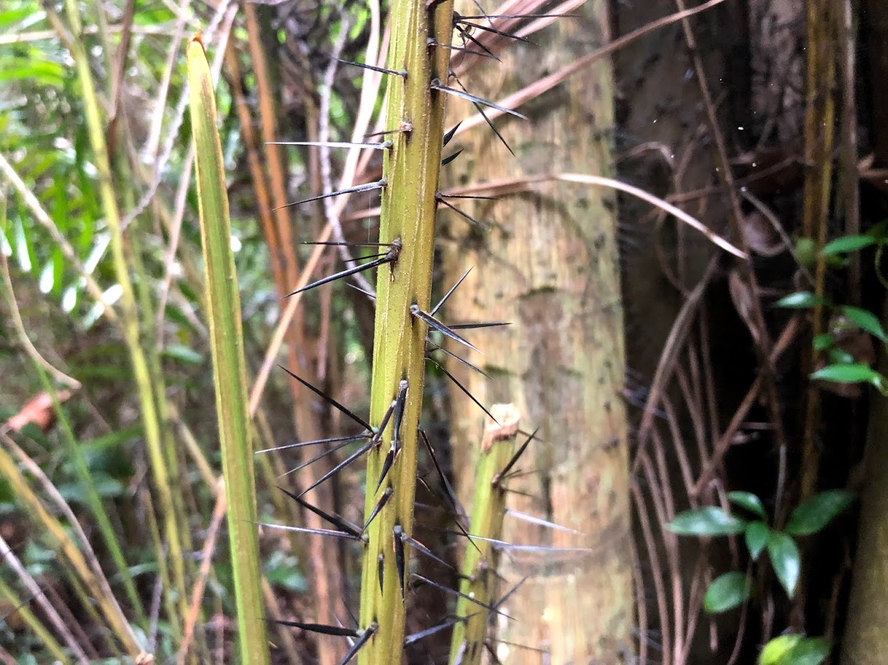 MsE had forgotten how to walk over rough ground - too much city living. We are always on smooth paths here; even the playground is a smooth solid rubber surface. MsI tripped over rocks and raised tree roots in the trail for at least 5 minutes, scowling at the trail when she did, until she got the hang of it. She did know how to stick to a trail better than her sisters did at 3 years old though. She also came quickly back if I told her she was too far ahead. As we walked MsI spotted a "lizard" and "2 spider webs," and we decided to very gently touch the trees covered in spikes.