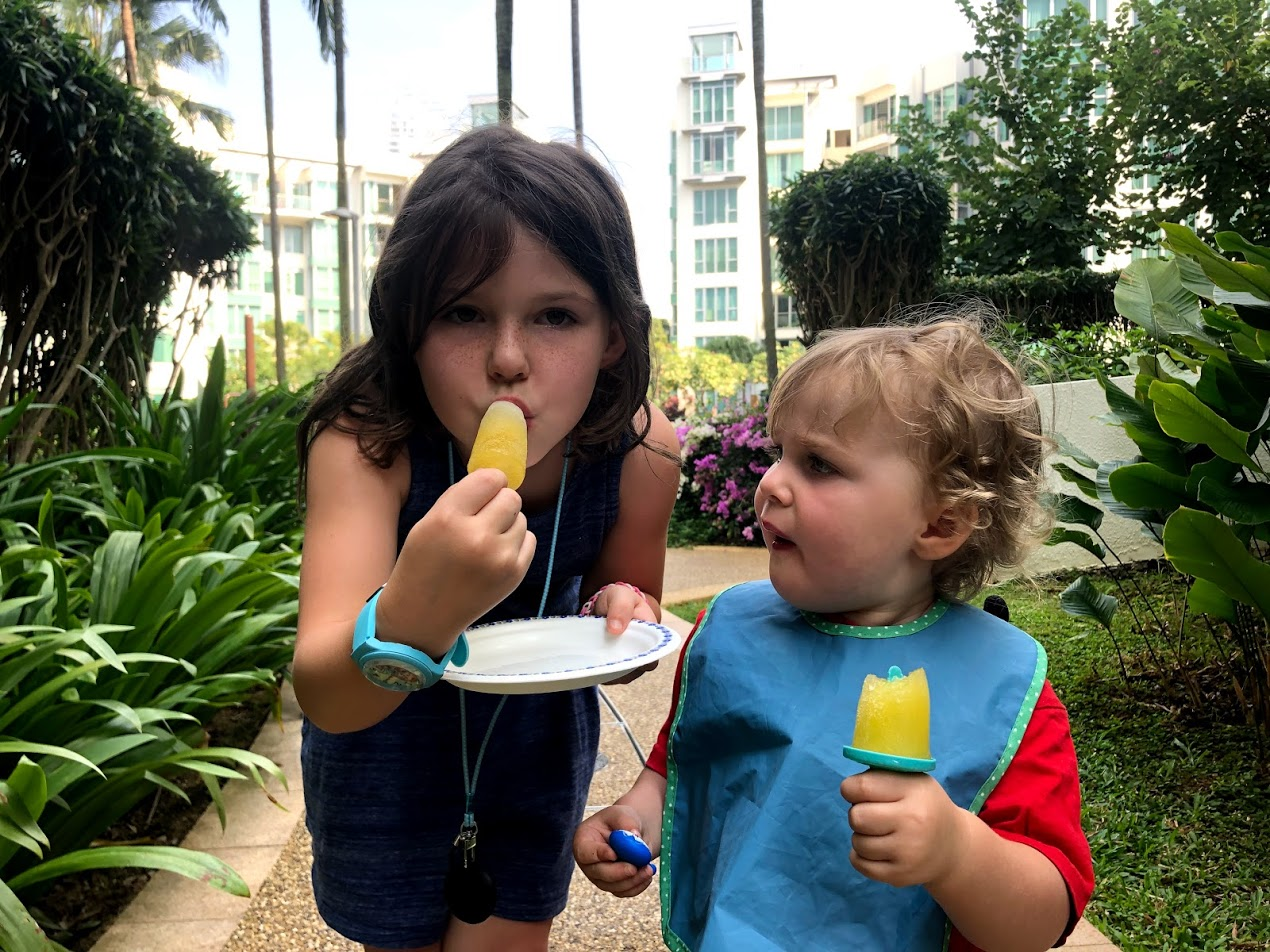 There are lovely walking trails on Sentosa Island. We like to start our walk with a popsicle from home.