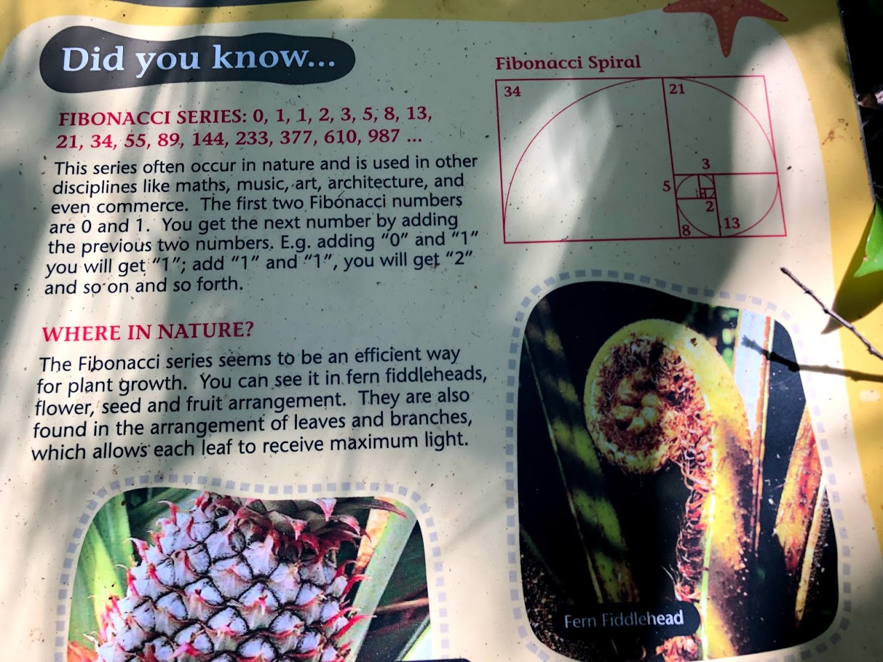 Some of the signs are really in depth, like this one below about Fibonacci Numbers. We pick a sign or 2 and focus on that for our walk. We often compare what we see to what we were used to seeing in Canada. We love the nature calls buttons in the centre which helps us identify what we're hearing on our walks.