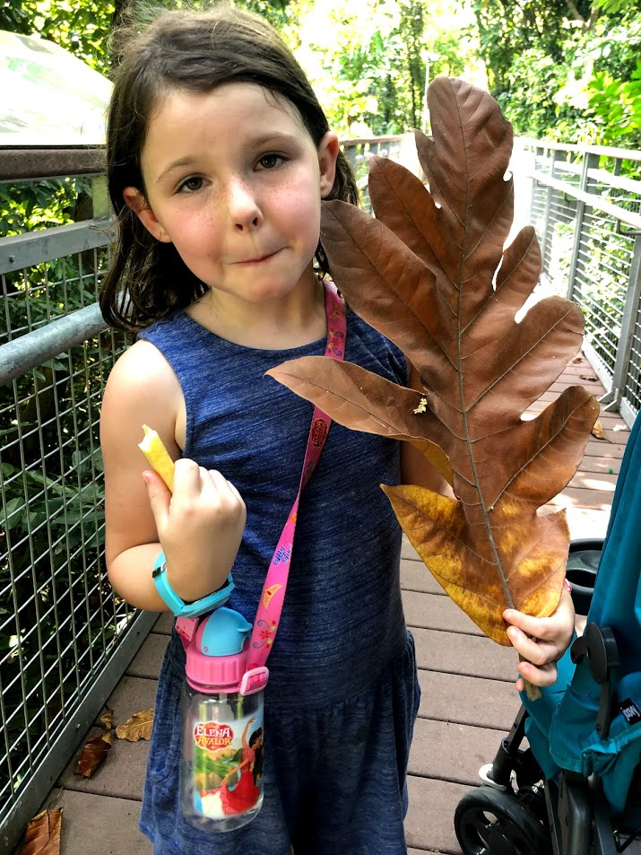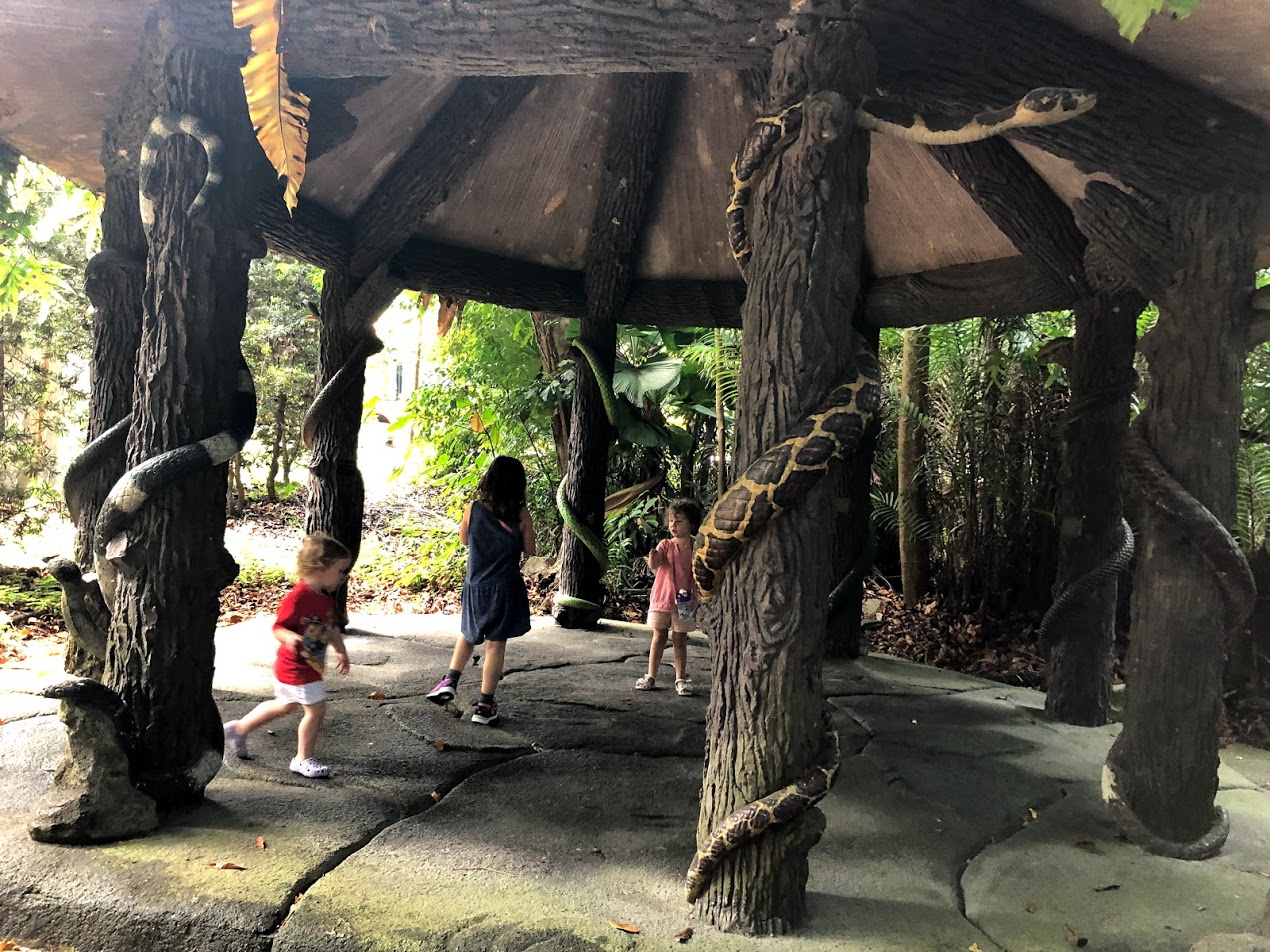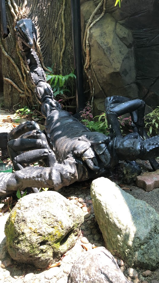 Actually one of the first things we did was talk about safety. We do need to remember this isn't Canada and our assumption about animals aren't always quite right. We spent a while talking about the poisonous animals found in Singapore: scorpions, centipedes, some snakes and larger lizards. We haven't come across any of these in real life on Sentosa, but there are some fun statues scattered along the trails. We found a fun way to learn the names of snakes too: choosing our favorite snake pillar at the rain shelter; each one is labeled.