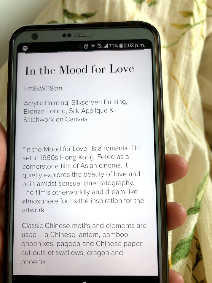 Then we bought a painting to remind us of Singapore. It's called "In the Mood for Love. It's not the original; it's one of 20 limited edition prints. The Chinese Shophouse in the painting is located at 2 Everton Road, Singapore. When MsC saw it she instantly pointed out the phoenix and reminded us of the legends we're heard here.