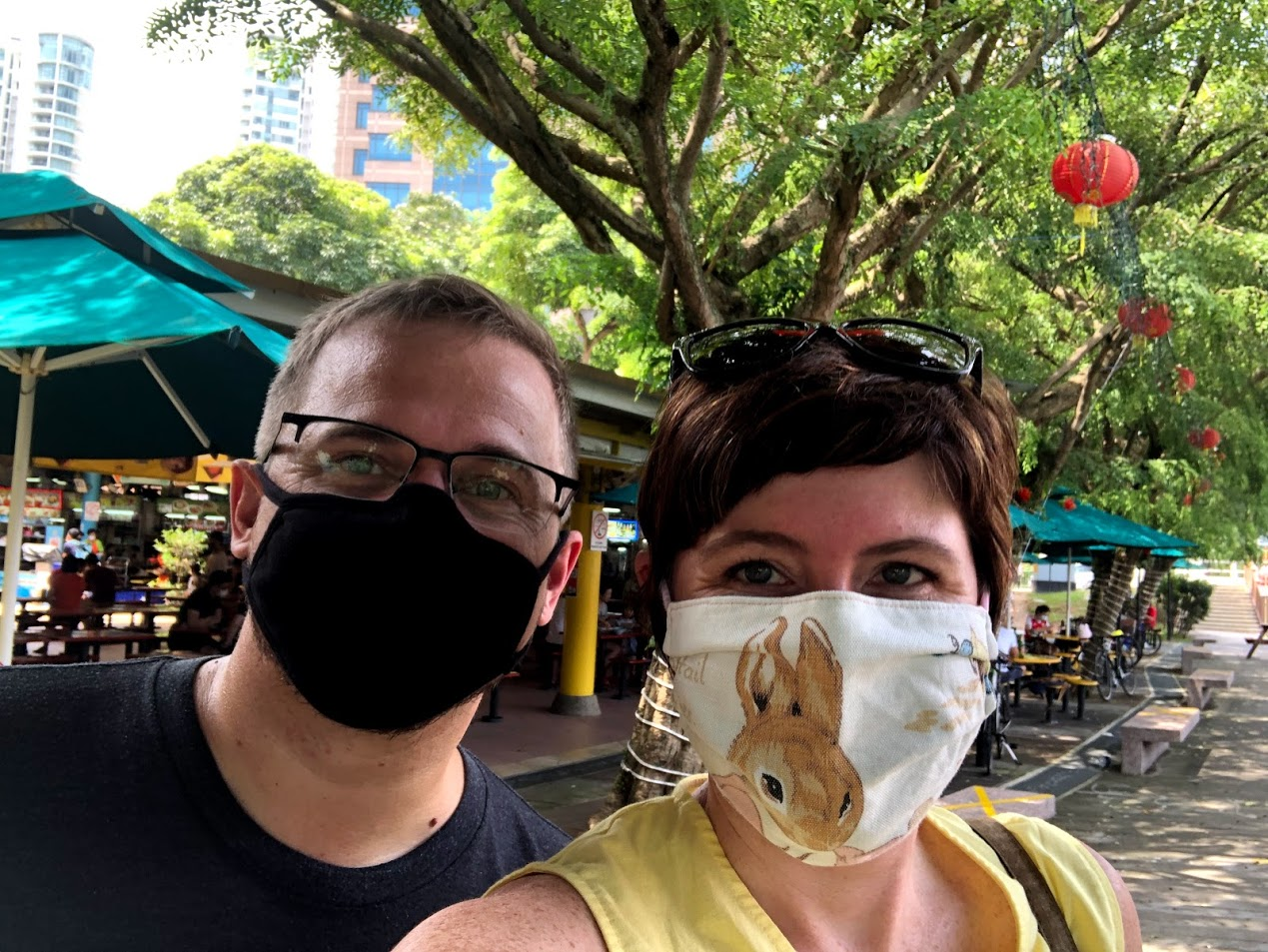 We saw quite a few walkers and a couple joggers and the odd cyclist while we were out. Eventually we passed an open air Hawker Centre and I picked up a Lemon Tea. The Auntie made it in a tall plastic glass stuffed with ice. She poured in strong hot black tea, along with a heaping spoonful of white sugar, a slice of lemon and topped the cup with a splash of cool water. I would order it again, maybe even without the sugar. Jonathan quenched his thirst with a bottle of water.
