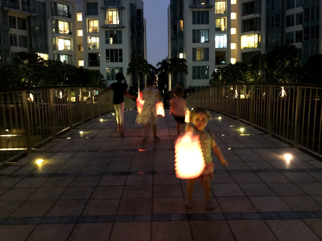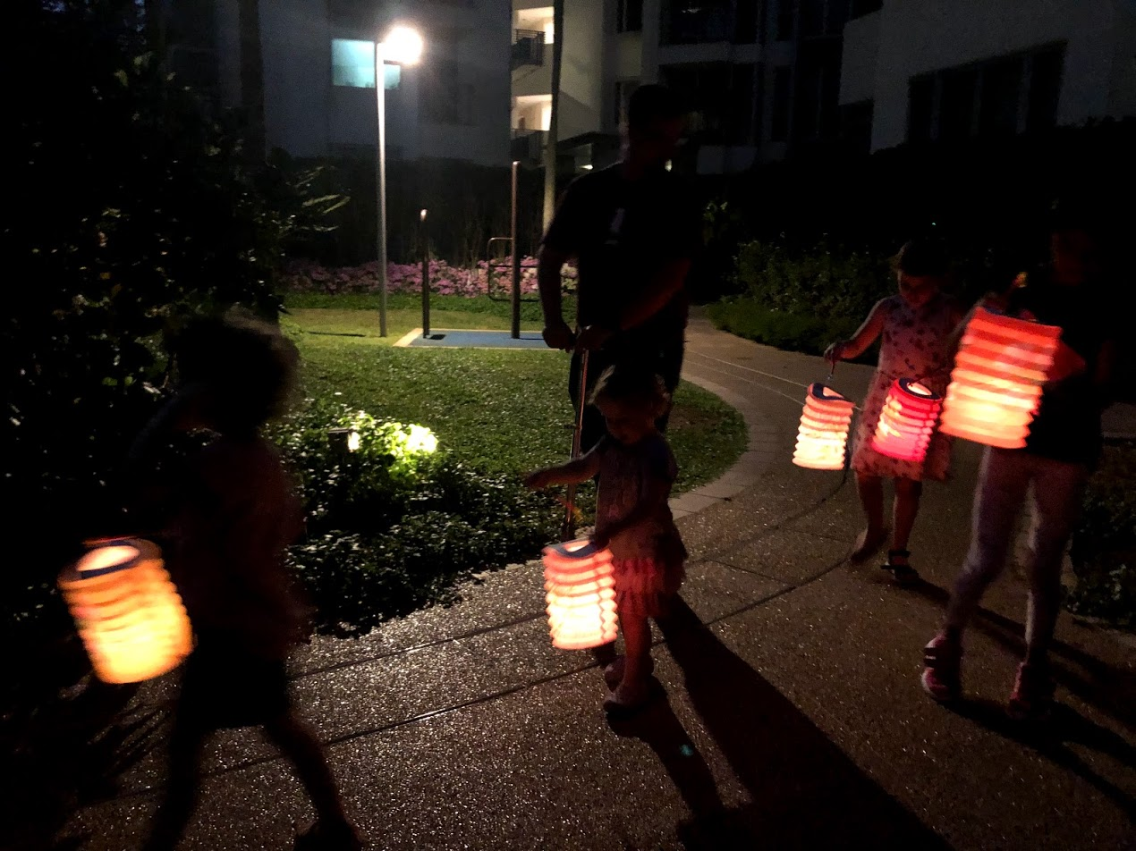 Last night the kids were a little squirmy from being inside all day. I had promised them a lantern walk as it was the actual date of Mid-Autumn Festival and the Full Moon. As soon as darkness fell at 7:15, we lit our lanterns and walked our friend home the slightly longer way. I was a bit disappointed that we didn't get to see the moon in the haze, but lanterns are always fun.