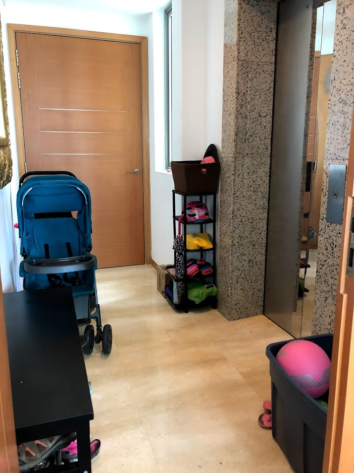 Each suite in our condo complex has a Private Lift (Elevator). This means only the 10 units in our row use the same Lift, and the lift will only stop at a unit if you have the correct key fob. Our Lobby also has 2 doors in addition to the Lift: One into our unit and the other out to the main hallway which has a Service Elevator where deliveries come and the stairwell exit for emergencies.