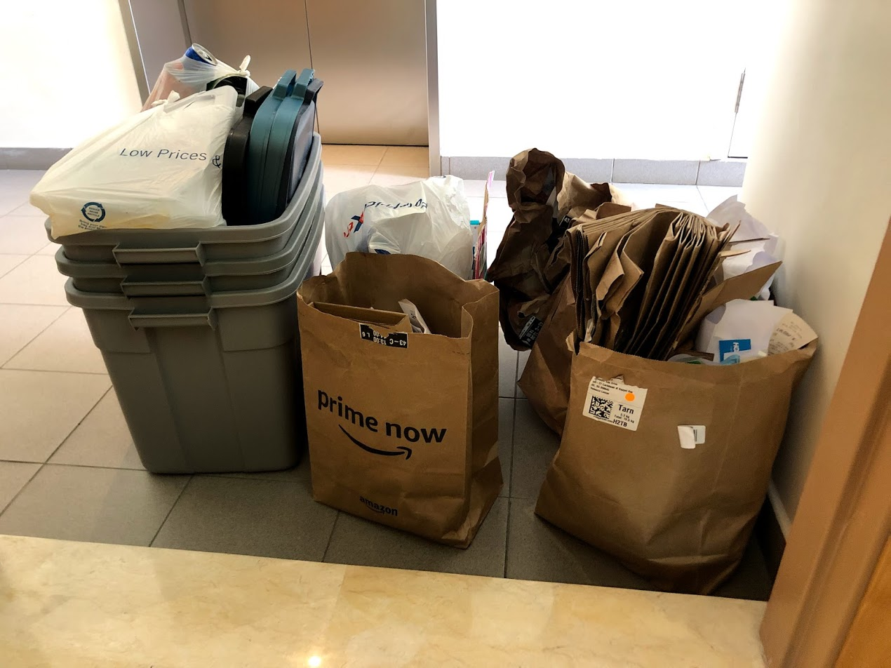 This is how bad I let the recycling get, before I took it down to the basement. I saw one of the Cleaners in the distance in the basement, but didn't run into anyone. I also realized we shouldn't share elevators with others anymore - not that it happens very often at home.