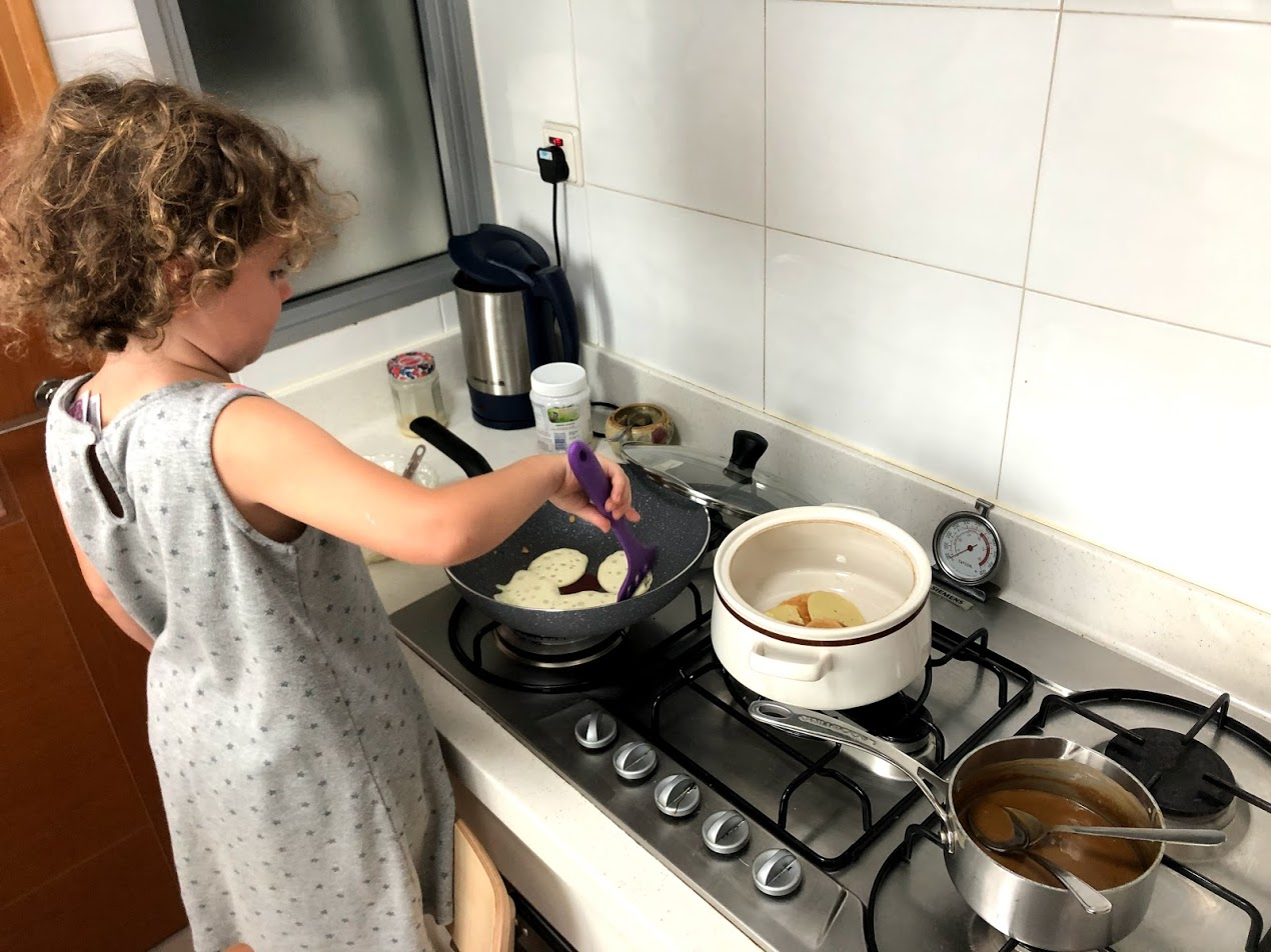 I wondered if MsE was too young to add the batter to the pan, and do the flipping. But I remembered how proud I was when my Granny always let me. I'm pretty sure I around age 5. Β I can still remember how incredibly proud I was the first time I flipped a pancake perfectly. Sarabi are even easier, because you don't flip them. You just wait till they're cooked through and then get them out of the pan.