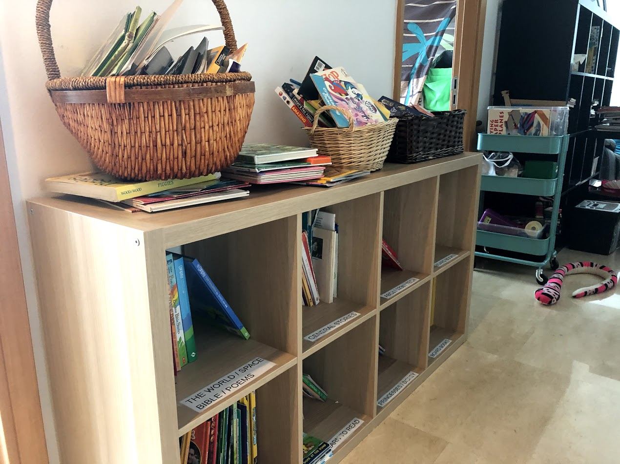 To organize the Lobby I built the small shelving unit you can see in the picture. It's technically a $10 shoe rack, and I've had it hanging around waiting to be set up for at least a month. Our shoes are on open shelving under the bench. I had kids sit and try on shoes. Now we're down to 3 pairs of shoes that won't fit for ages and 2 pairs of adult hiking boots. I put them away in our "out of season clothes" closet (MsI's room).