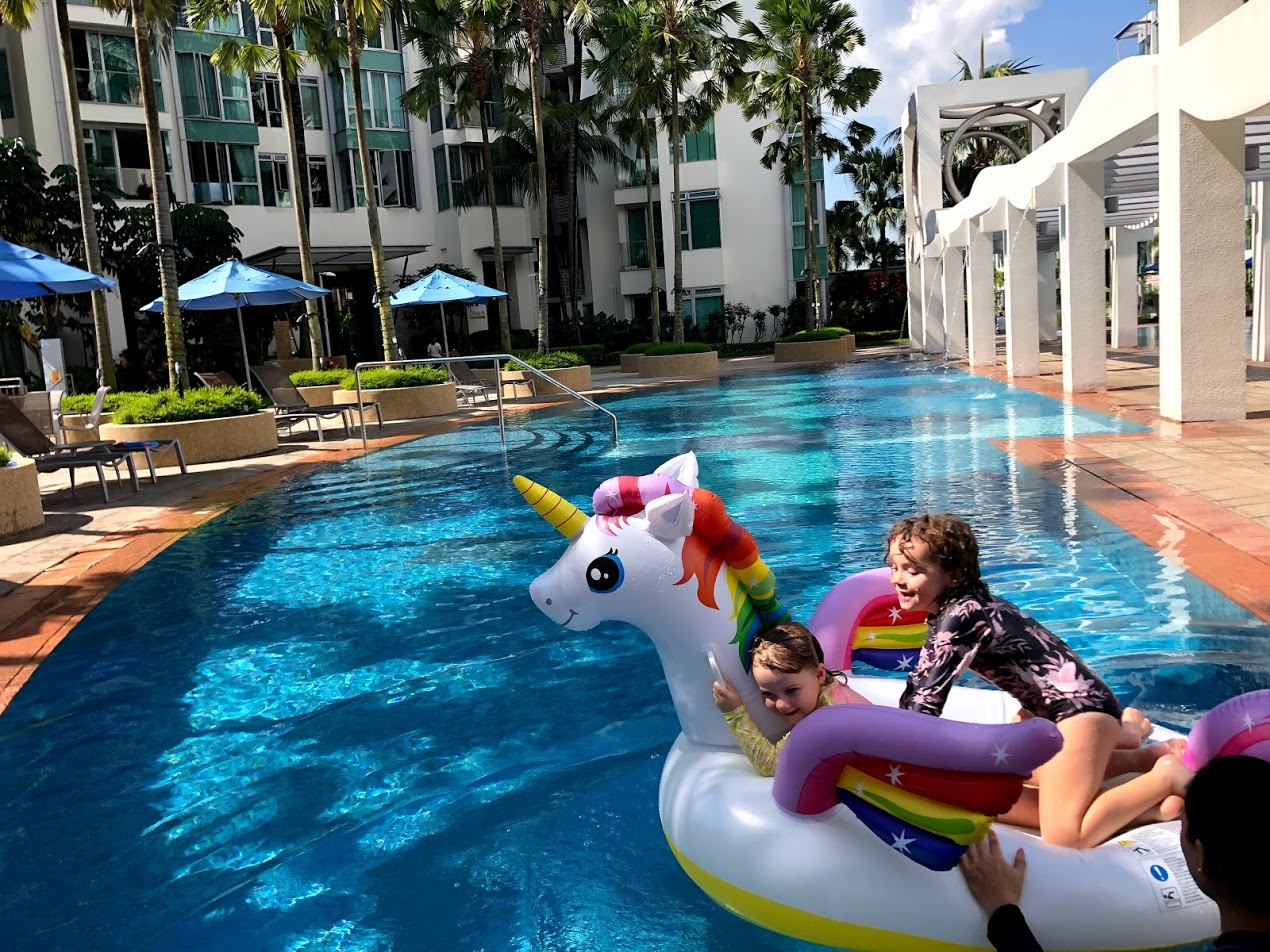 So when Jonathan couldn't make it to the pool one morning, we decided to have a Pool Day! Us girls headed to the big Clubhouse pool and we spent a few hours there: using all 3 swimming pools, the waterslide and even the jacuzzi. MsE even talked us into bringing the giant unicorn floatie, which is only brought out occasionally on weekends.
