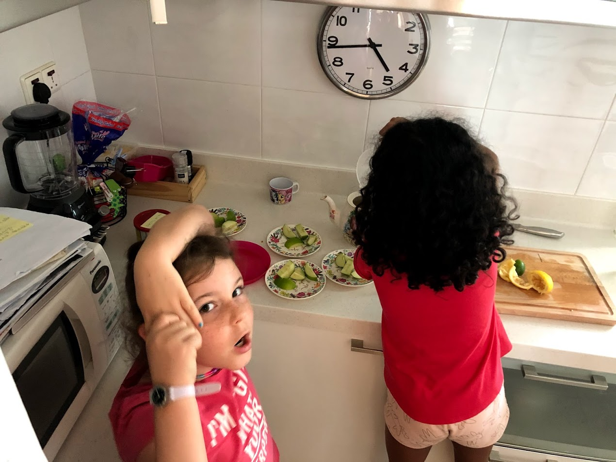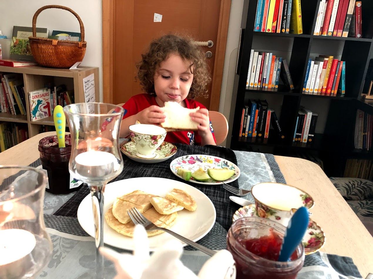 They made homemade lemonade, according to the secret recipe, cut up apples, and re-heated pancakes that we ate with jam. In honour of their contribution, I pulled out table cloths, candles, and the "good" china.