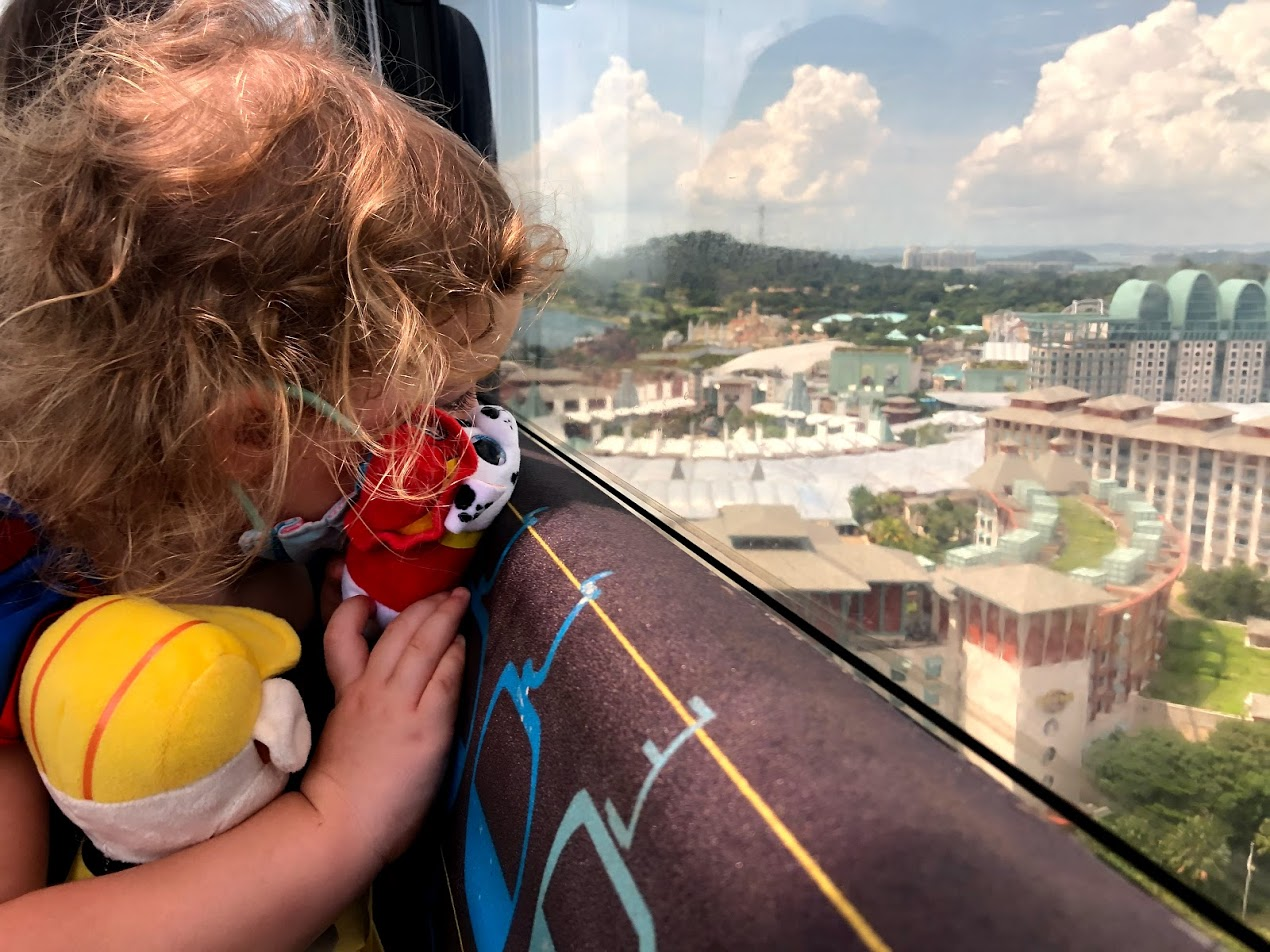 We did the whole round trip without getting off: Harbourfront Station to Sentosa Island back through Harbourfront Station, then up to Mt Faber and back Harbourfront Station). The ride takes about an hour to do all at once. MsI shouted out the Merlion and the Dolphins in their Aquarium tanks, but she probably could have passed on the up the mountain side (it's over the trees).
