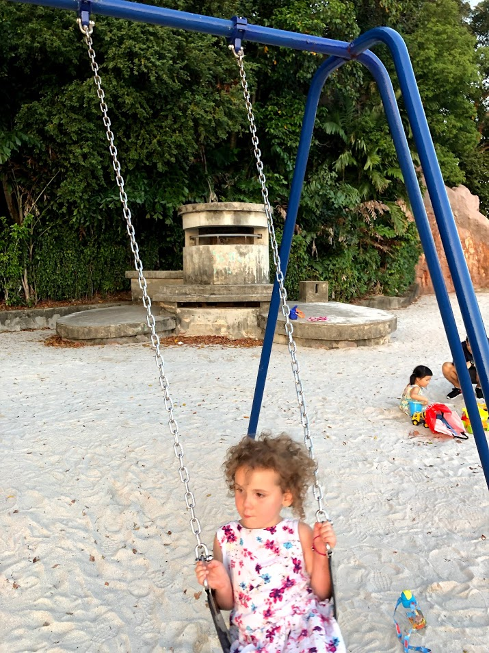 About 30 minutes along the Boardwalk (about 1/2 way) you turn out of the harbour and there's a small playground. It's pretty old-school, with a teeter-totter, swings, and an actual metal Merry-Go-Round. But the kids loved it, besides sand is always fun. There's some old military stuff around, and interesting signage explaining the harbour's history. I like all the comments about pirates!
