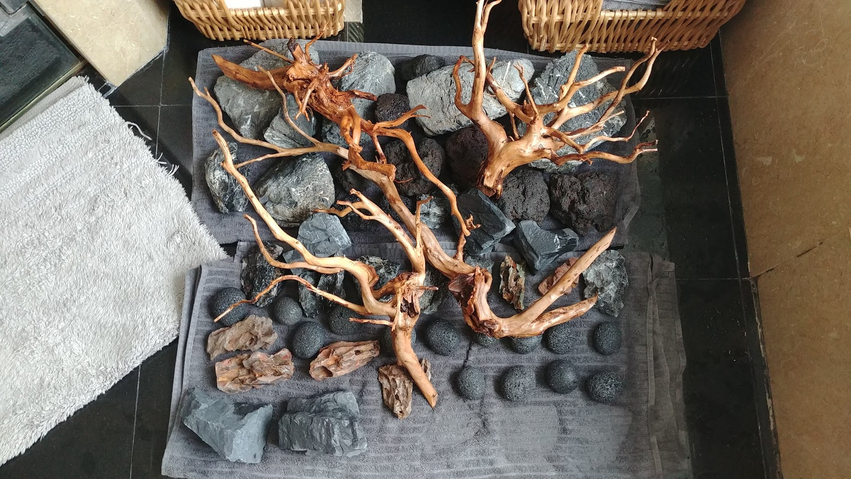 First supplies started trickling into the house by delivery. Then Jonathan brought rocks home bags of rocks from the Aquatic Store which were all washed. Next came a night of cleaning of the tanks and then trying out rock layouts. There were thin branches, waterlogged driftwood, and rocks in about 4 colours to choose from. Jonathan cut a piece of plastic grid for the bottom of each of the girl's tanks to minimize the chance of the glass breaking if the girls drop a rock when placing them into the tank. The grid also worked great for letting the girls see how much space they had to work with.