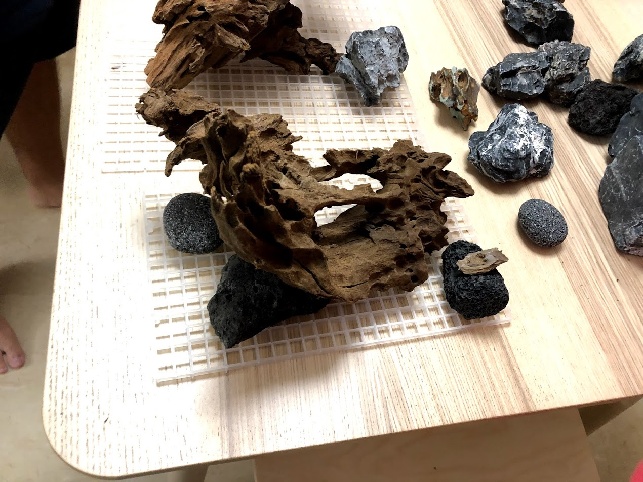 MsE tried out about 3 combinations before seizing a large piece of driftwood, which was originally intended for Jonathan's large tank. She had her heart set on it, choosing her final accompanying rocks moments later, and then that was that. After more than an hour we packed the supplies up on her and sent her onto bed. There's a large bin of rocks in the dining room.