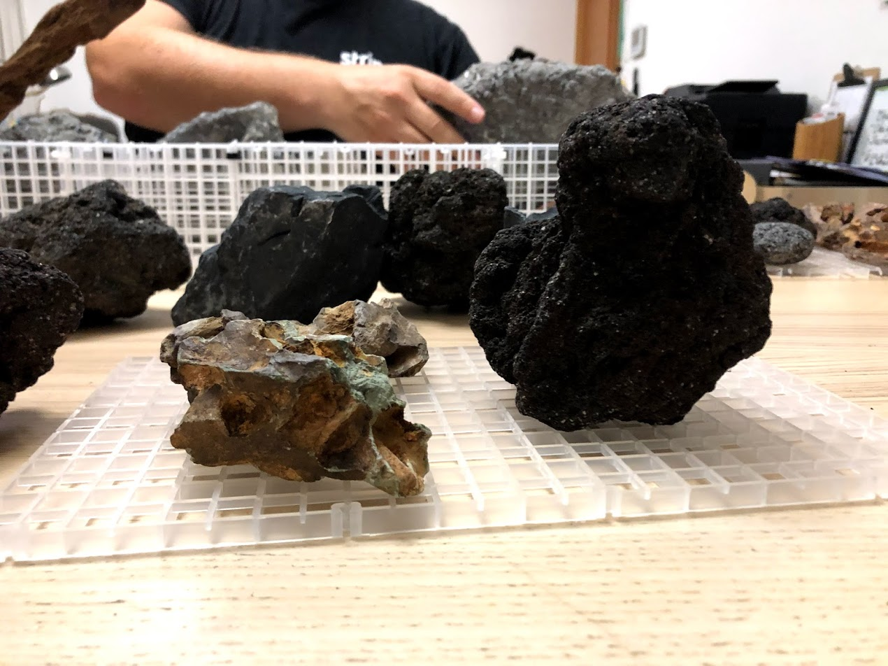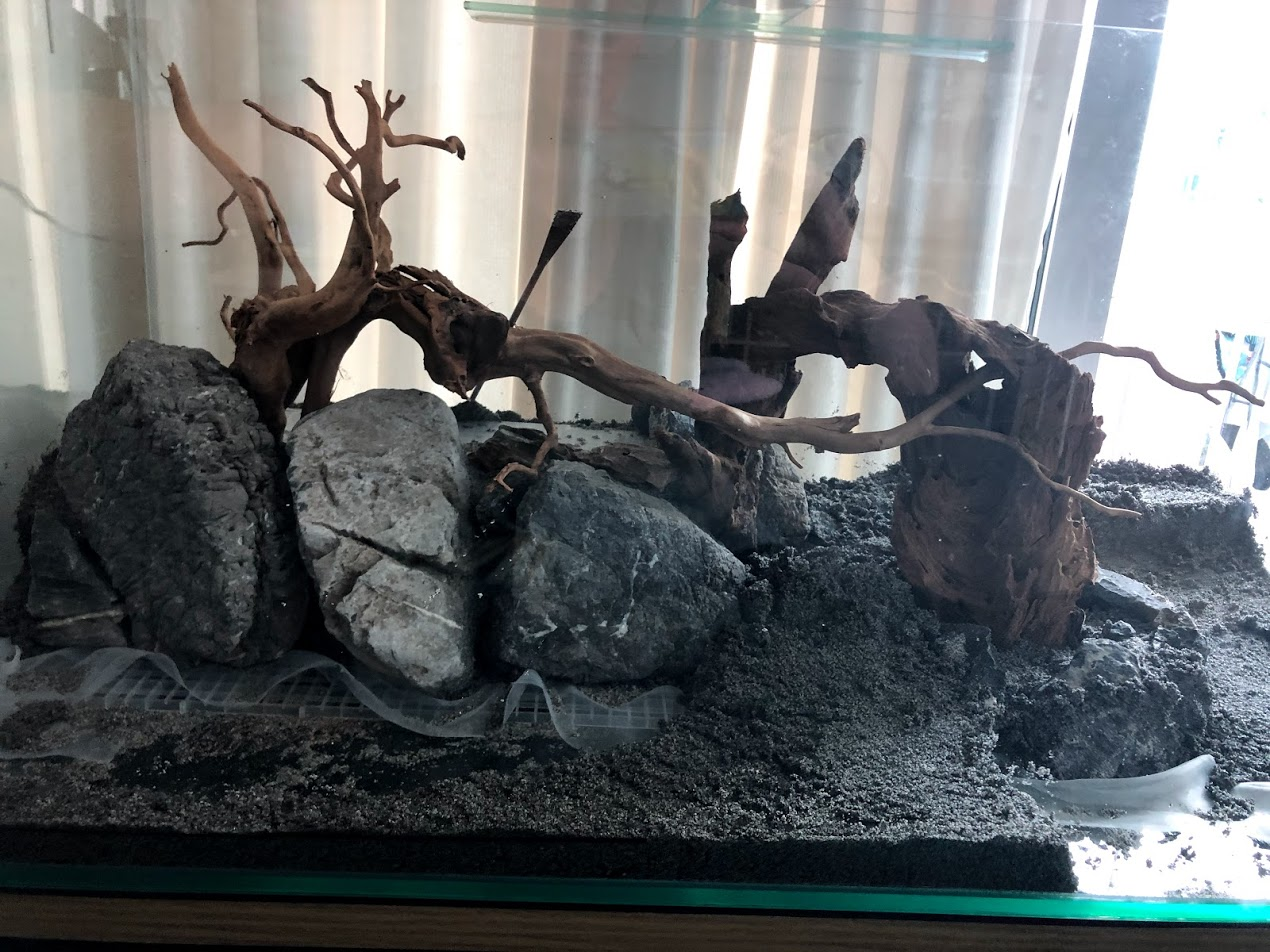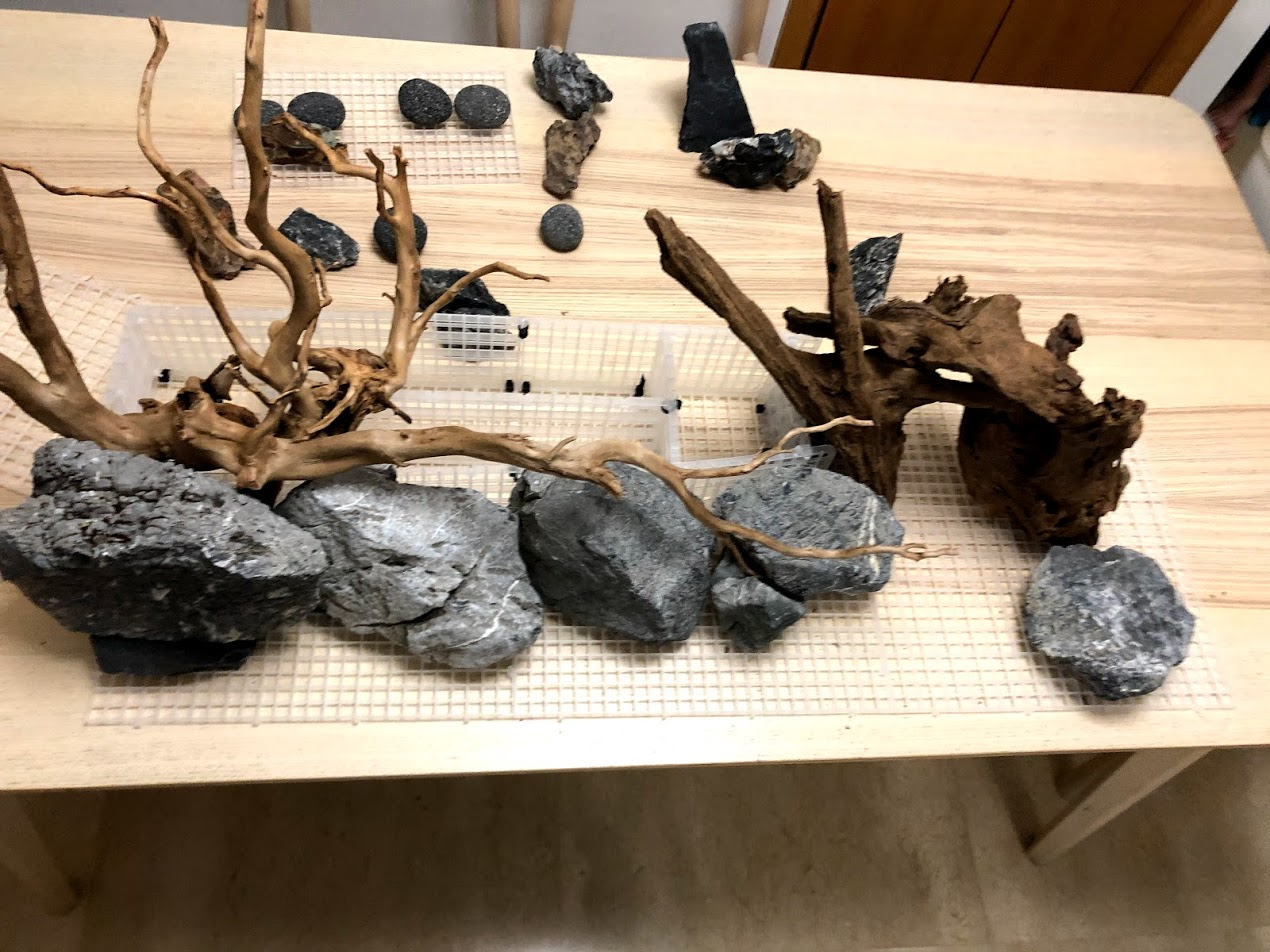 Below was Jonathan's final selection before moving it into the big tank. The grid on the bottom is actually smaller than the fish tank. He's mainly using the grid to build up a hill at the back of the tank that will be covered with a fine mesh that the dirt can go right on. He told me you can't put the dirt very thick or the water will get really muddy, and the alternative of just building a large sandbank is rather expensive. Sand goes over the dirt to keep the dirt down.
